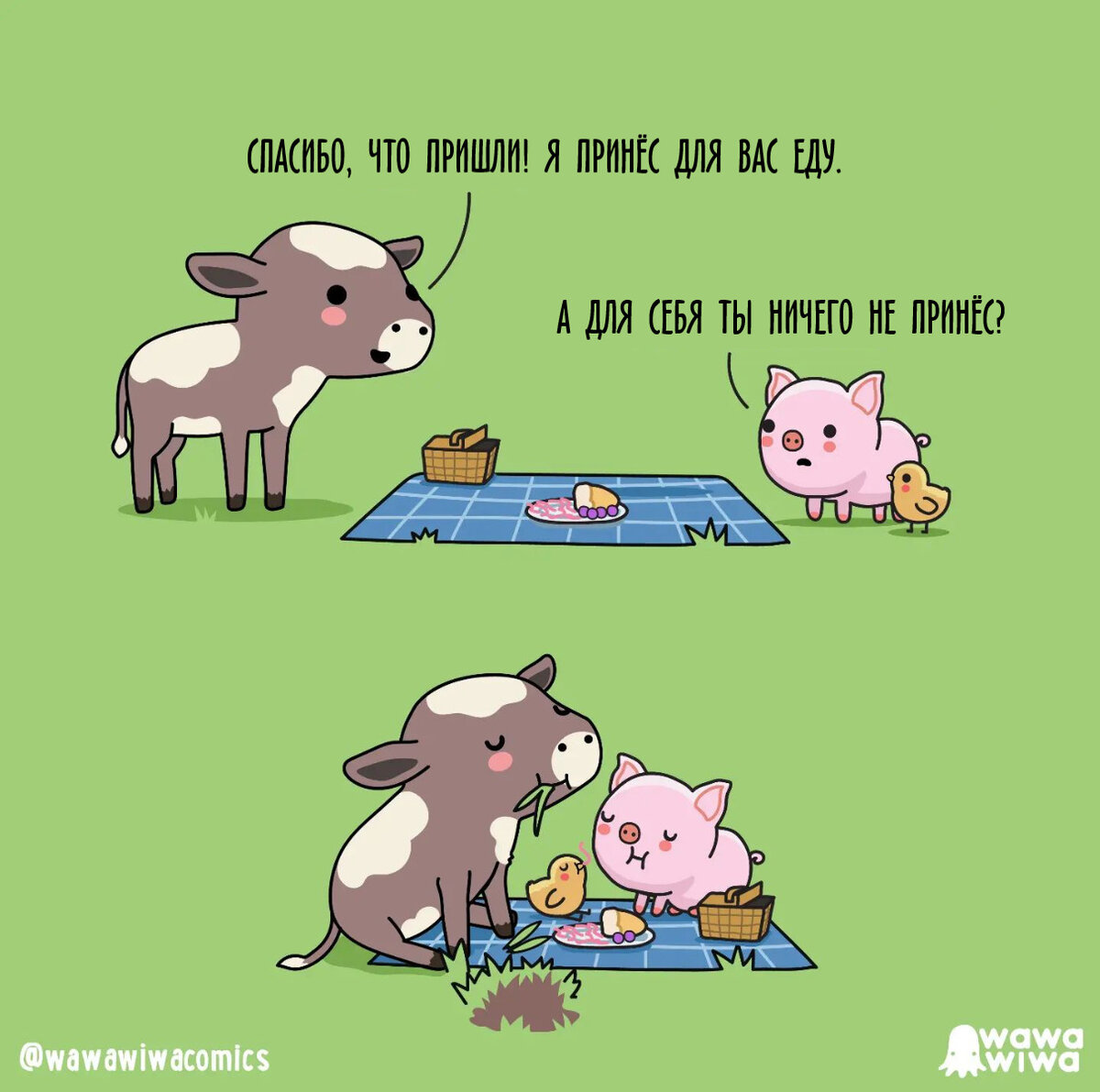 Привет, дорогой друг! Сегодня я подобрал для вас еще одну интересную и актуальную тему. В этот раз я хочу поделиться с вами сюжетами, которые будут буквально наполнены самыми теплыми и нежными чувствами. Ведь они о доброте. Согласитесь — это именно то, что всем нам сейчас очень нужно. Герой комикса Wawawiwa, самый настоящий и преданный друг. Ведь он думает в первую очередь не о себе. Даже когда дело касается еды. Согласитесь — это очень мило и трогательно! Настоящая доброта проявляется не только в словах, но и в поступках. Персонажы комикса Dinos and Comics, лишний раз подтверждают, что нужно делиться от души. Ведь если так делать, то и с вами кто-то обязательно поделится. Даже самые большие и страшные, могут оказаться очень милыми и добрыми. Смотри, на что готов грозный и большой крокодил, чтобы сохранить тепло и уют своего маленького друга. Автор Chow Hon Lam точно знает, что такое мимишность) Быть добрым важно не только к своим близким, но и к "чужим людям". Я считаю, что только сам