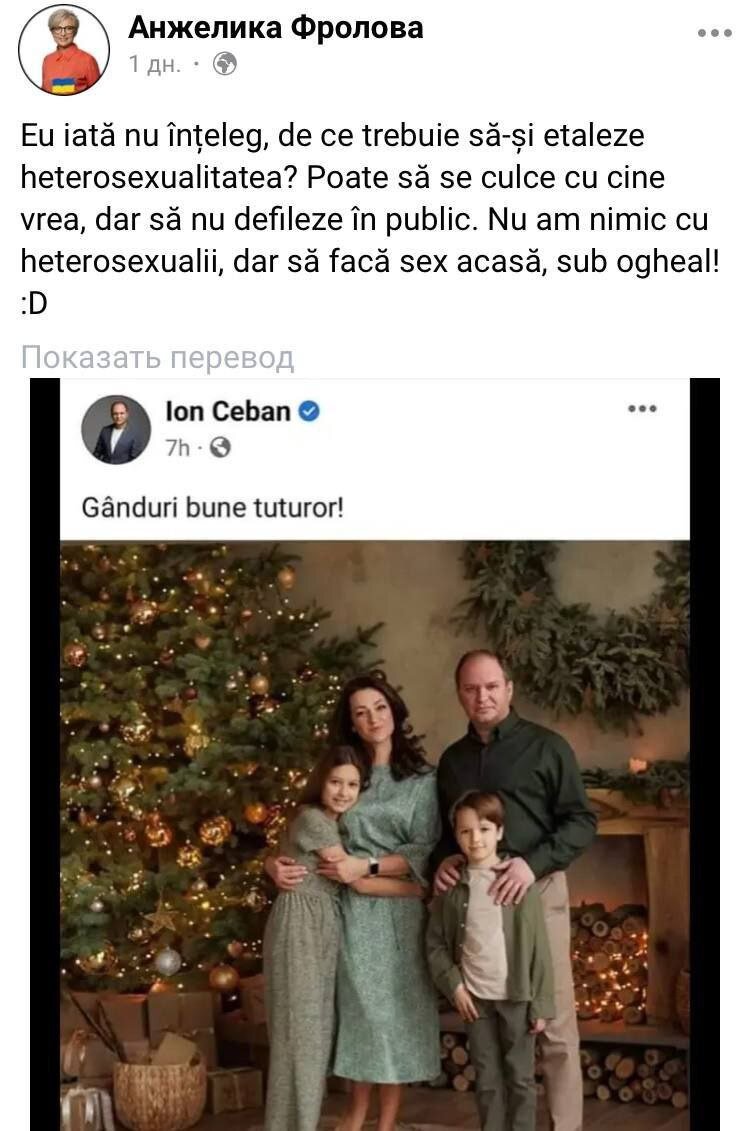 Скандал разразился в Молдове после того, как мэр Кишинева Ион Чебан разместил в своей соцсети семейное фото в качестве поздравления с Новым годом: он с женой и детьми под елкой. Это возмутило молдавскую ЛГБТ-активистку Анжелику Фролову. Она усмотрела в фото недопустимую демонстрацию гетеросексуальности.