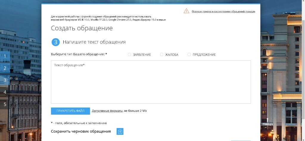 - Заполните обязательные поля. Во вкладке «Напишите текст обращения» выберите тип обращения – предложение.