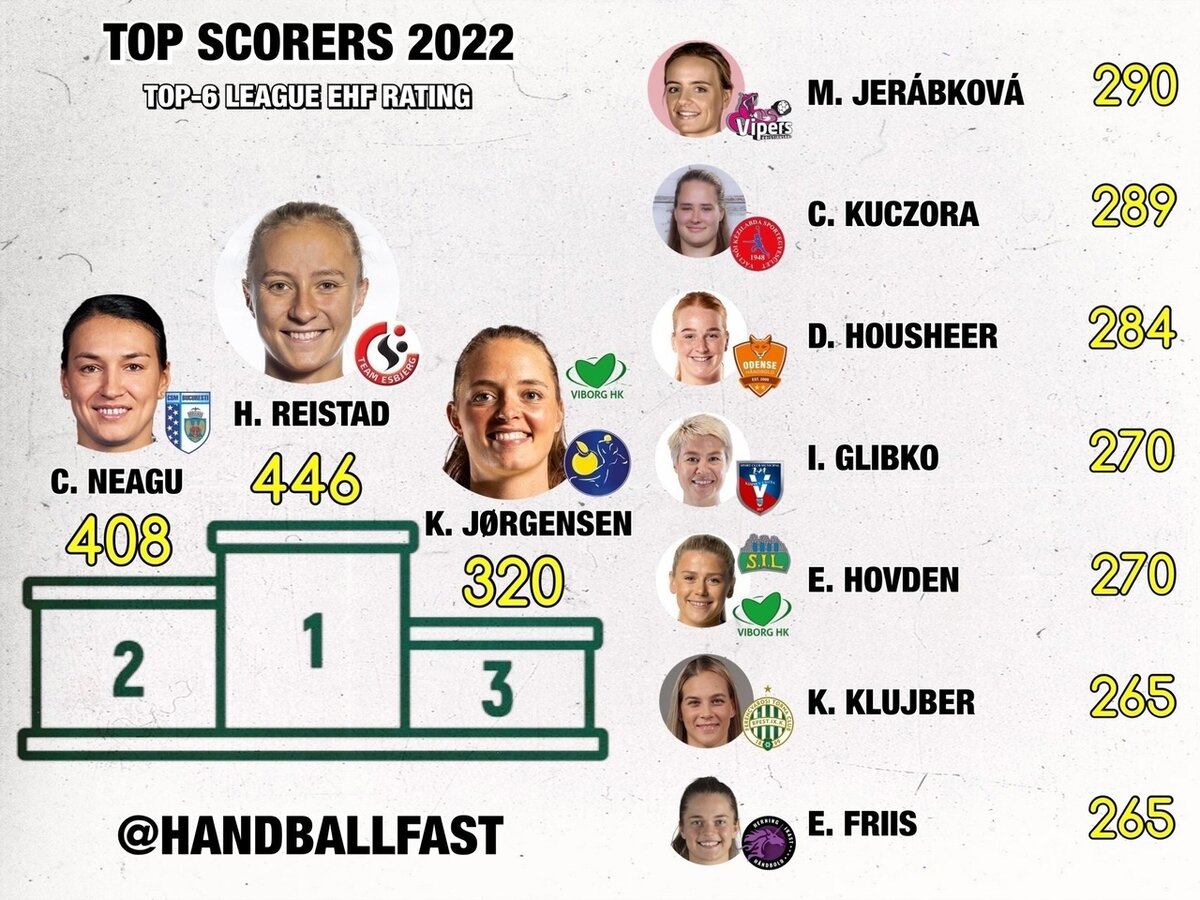 Далее идёт Кристина Нягу с 7,4 голами за игру. Хенню Рейстад в среднем забрасывала 6,9 мячей за матч, Ценге Куцора — 6,6, Камилла Херрем — 6,4, Анна Вяхирева (Россия, "Ростов-Дон", "Кристиансанд") — 6,2, Ирина Глибко — 6,1.