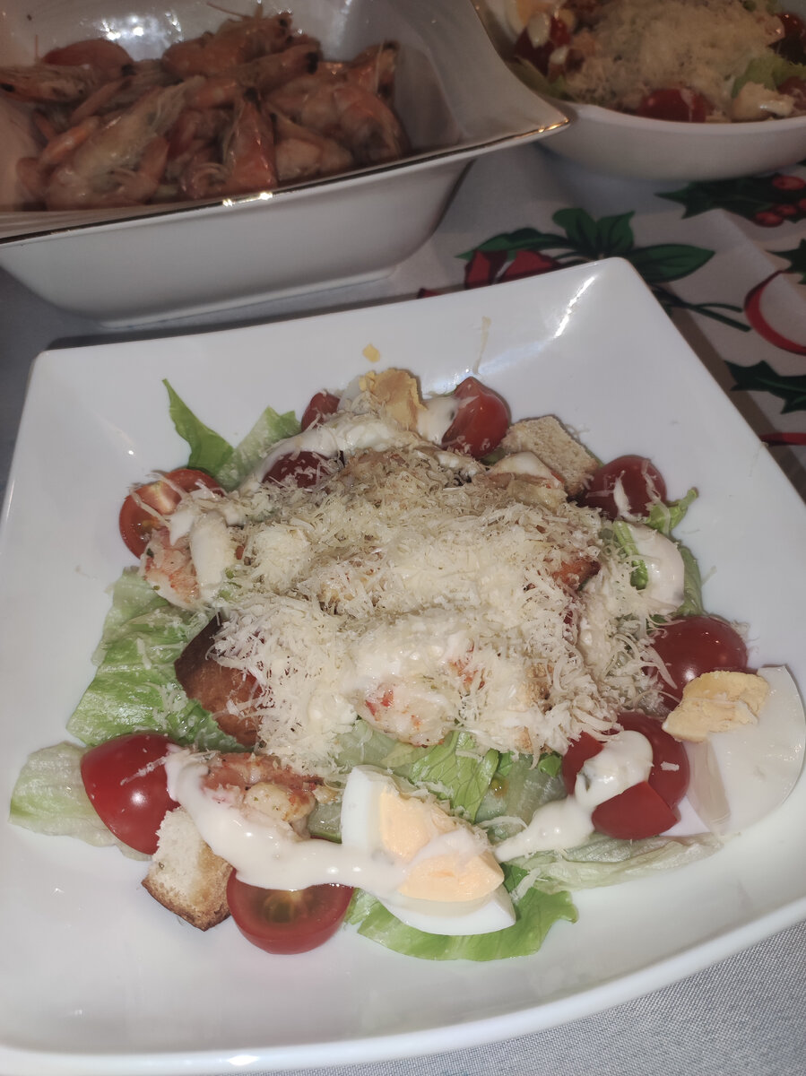 Лёгкий, сытный всеми любимый "Цезарь" Соус я обычно готовлю из оливкового масла, горчицы, желтка яиц. Но после праздников поленилась и купила готовый . Салат: Айсберг Томаты черри Яйцо Сухари ( делала батон в духовке) Креветки Твёрдый сыр Очень вкусно и не тяжело. Приятного аппетита! 😍