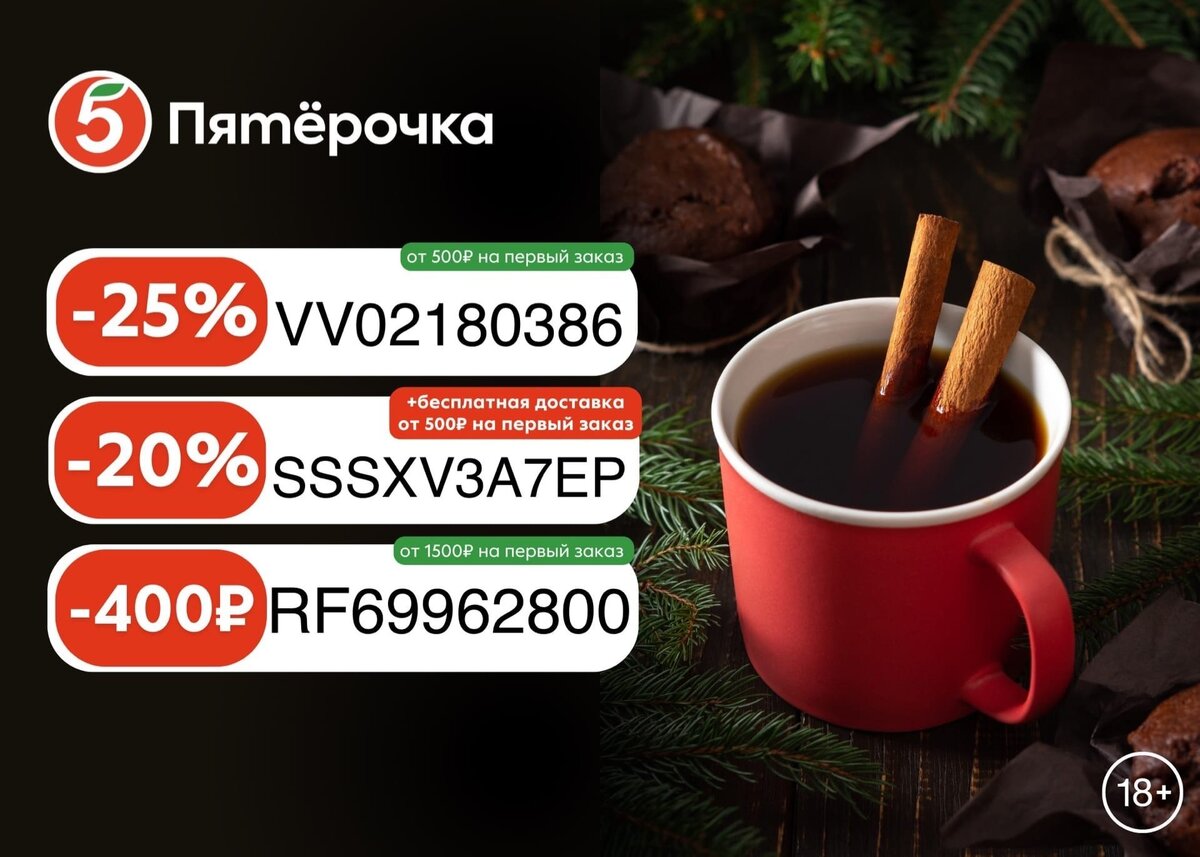 Приложение «Пятёрочка» промокоды на первые и повторные заказы, доставка 45 минут