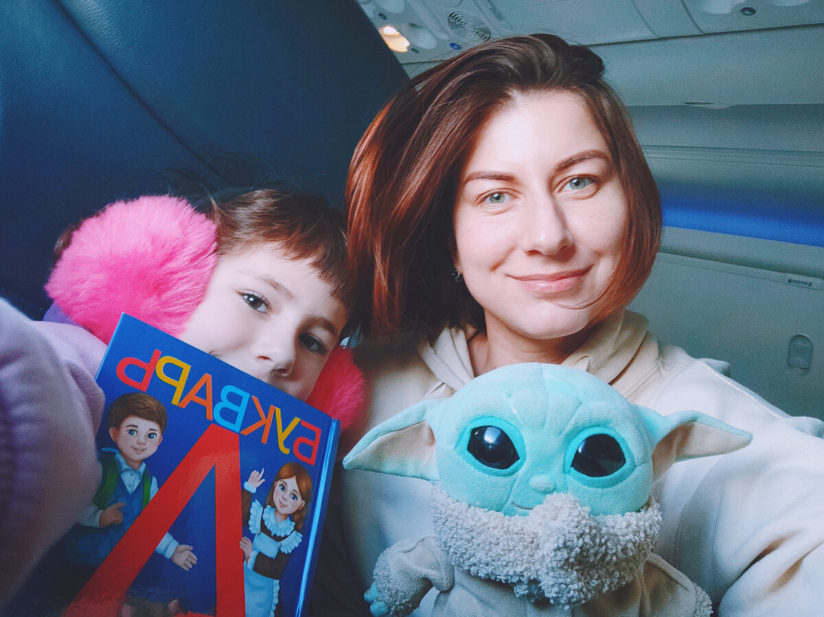 Рано утро второго января мы отправились в аэропорт и наше путешествие началось. Спали мало, были сонные. Очень хотела выпить кофе, выпила его за какую-то конскую цену - 395 р в Коржове. Ох уж эти цены в аэропорту, никогда такой дорогой кофе не пила. Сели в самолёт, места хорошие, у окна. Потому, что мы их сами выбрали. У Победы важно зарегистрироваться заранее, чтобы точно попасть на самолёт. Вот такой компанией мы летим. Йода наш компаньон. Он прилетел к нам из Нью-Йорка и теперь уже пару лет дочка берёт его везде с собой. А ещё с нами летит букварь, его подарили на Новый год или друзья. Он похож на тот, по которому мы занимались в школе в своё время. Потрясающий рассвет, золотое солнце проникло в салон самолёте. В этот момент я поняла, как давно не видела солнечного света. Я почувствовала как внутри он начал наполнять меня и как безостановочно начал вырабатываться гормон радости. Последние месяцы я чувствую его нехватку. Я была счастлива, смотрела в окно завороженно. Мы почитали