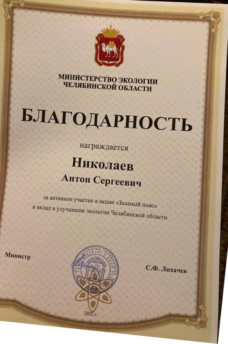 Председатель совета ветеранов управления Росгвардии по Челябинской области Антон Николаев удостоен благодарности Министра экологии Челябинской области за активное участие в акции «Зеленый пояс» и вклад в улучшение экологии в регионе. В апреле 2021 года в рамках движения «Полки Победы», основанного ветераном СОБР Росгвардии, состоялась первая высадка более 15 тысяч саженцев кедра. От этой даты берет свое начало акция «Аллея Славы». Высадка деревьев по всему Южному Уралу, говорит идейный вдохновитель акции Антон Николаев, стала символом увековечения погибших на фронтах войны жителей области. «Аллеи славы уже стали символом памяти о героизме, крепости и несгибаемости русского воинства, солдат и офицеров, кто в тяжелейших сражениях защищал Родину», – поделился председатель совета ветеранов Управления Росгвардии по Челябинской области Антон Николаев. На Южном Урале при непосредственном участии территориального управления Росгвардии, поддержке регионального управления Следственного комитета,