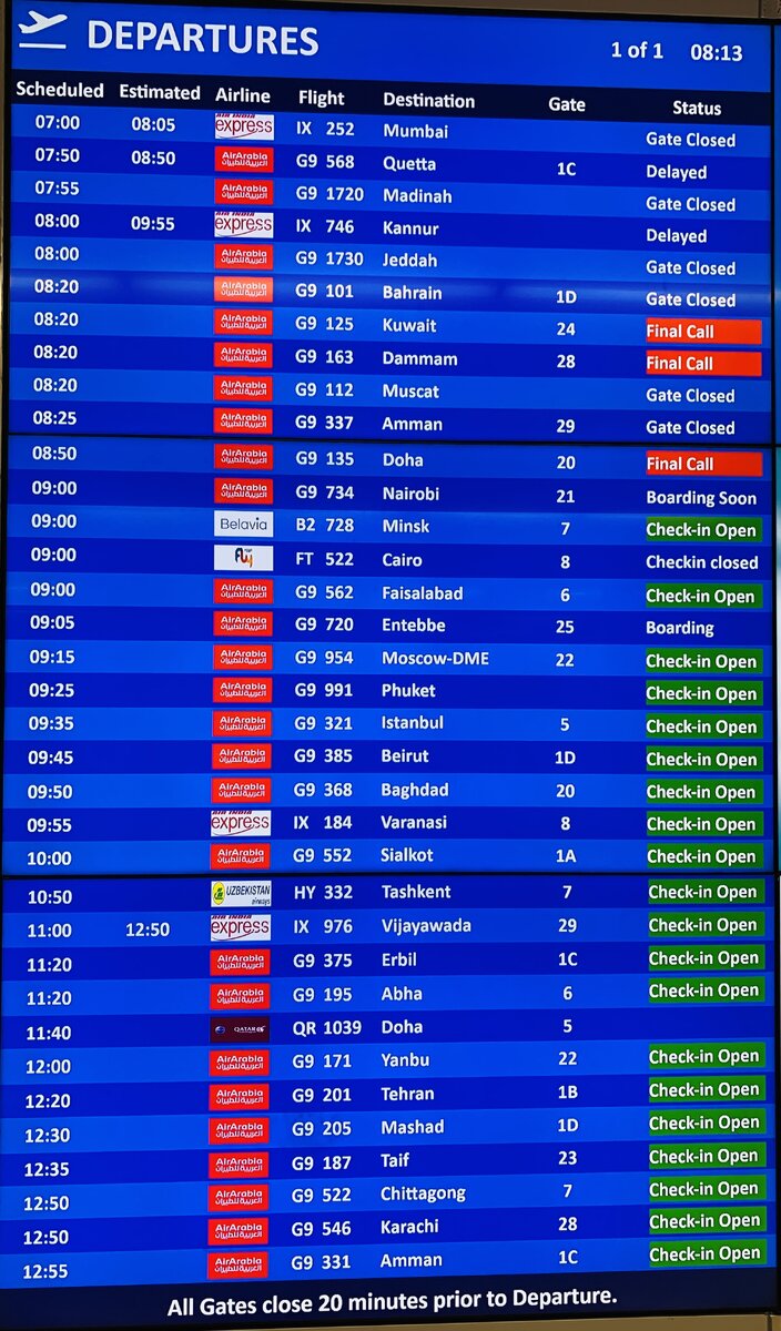 Всем, привет ! С Вами, GIR-insulinчик ! 02.01.2023 вылетали с этого аэропорта домой (аэропорт расположен недалеко от г. Шарджа). Раньше в ОАЭ прилетал и вылетал с семьёй только с аэропорта Дубай, а в этом аэропорту я был впервые! Посмотрел на пассажиров в аэропорту и сложилось чёткое впечатление, что это аэропорт в основном для «обслуживающего персонала» ОАЭ, а также: для небольшого количества деловых партнёров (мелкого и среднего бизнеса), для перелётов в соседние государства, для немногого количества «затесавшихся» туристов, что подтвердилось посмотрев на табло вылета: и на арабском: Пакистан 🇵🇰 = 4 вылета: в Кветту («плодовый сад Пакистана»), в Фейсалабад (столица провинции Пенджаб), в Сиалкот (промышленный центр в провинции Пенджаб) и в Карачи. Индия 🇮🇳 = 4 вылета: в Мумбаи (столица Болливуда), в Каннур, в Варанаси (если память не изменяет, то есть две серии путешествия проекта «Орёл и решка» в этот город) и в Виджаявада. Бангладеш 🇧🇩 = 1 вылет в Читтагонг. Иран 🇮🇷 = 2 в