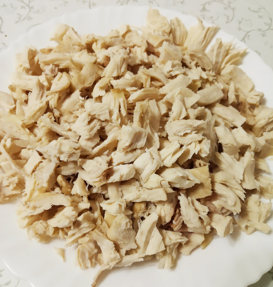Отвариваем куриное филе в подсоленной воде. Нарезаем небольшими кубиками, либо разделяем мясо на тонкие волокна.