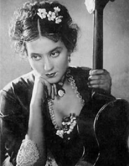 Об экранизации Рязанова я уже много писала, в том числе и о моём отношении к понятию «по мотивам», когда слишком густо это смешано с подлинным текстом, да к тому же – и с первым фильмом (подчас до смешного: и у Протазанова, и у Рязанова есть – ещё в «предыстории» - сцена с предложением продать «Ласточку» и отказом Паратова, и у того, и у другого Огудалова бранит прислугу на лишние траты; литературоведы с юмором вспоминают попа, играющего в карты у Огудаловых, – так ведь и у Рязанова он есть!). Сейчас только о Ларисе. Для меня она, извините, никакая, и дело даже не в том, что образ создавался, по существу, тремя актрисами (сама роль, озвучание, вокал), - просто бродящая, как тень, хорошенькая девушка, как мне показалось, напрочь лишённая темперамента, - разве это Лариса? И снова сравнение не в пользу «Жестокого романса» - танец Ларисы: у Рязанова, по существу, только крупные планы, танца как такового нет, в старом же фильме… Впрочем, кто хочет – сам увидит (скан, увы, очень плох, но найти что-то лучшее не смогла).