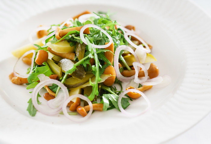 Ингредиенты: - Опята маринованные - 100 г - Горошек консервир. - 100 г - Перец болгарский крупный - 1 шт. - Лук красный - 1 шт. - Лимонный сок - 1 ч.л. - Зелень - зелёный лук, укроп, кинза - Перец черный - по вкусу - Соль - по вкусу - Масло растительное Приготовление: 1. Лук нарезаем соломкой и заливаем кипятком на пару минут, чтобы убрать горечь. 2. Болгарский перец тоже режем соломкой. 3. Измельчаем зелень. 4. Смешиваем растительное масло, лимонный сок, соль и перец. 5. Соединяем все ингредиенты, заправляем салат и оставляем на 2 часа в холодильнике. Приятного аппетита!