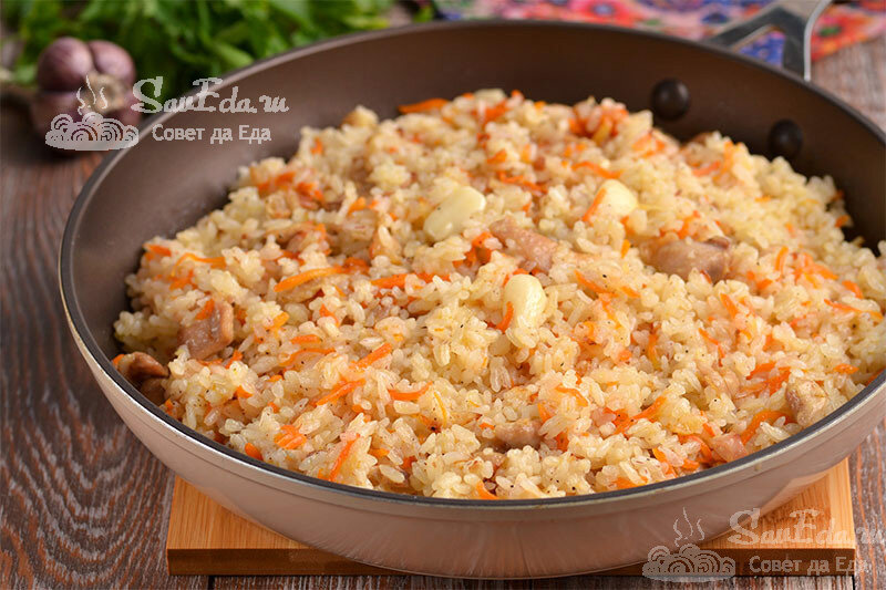 У любого блюда есть свои тонкости приготовления, тем более когда речь заходит о рисе. Сегодня покажу, как готовлю рассыпчатый и очень вкусный рис с курицей. Вместо курицы может быть индейка, говядина, свинина или баранина (будет разное время приготовления). Принцип приготовления очень похож на приготовление плова, но за счет использования курицы, не могу это блюдо назвать пловом. Плов — это про рис с бараниной или говядиной. Порции 5 Время подготовки 25 минут Время приготовления 30 минут Ингредиенты Инструкции 1. Для приготовления можно брать любые куриные части (у меня окорочок). Срезаем мясо с костей, нарезаем на средние кусочки, отправляем в горячее масло в сковороду и быстро готовим на сильном огне, помешивая. Кусочки должны зарумяниться. 2. Рис промываем. Для приготовления подойдет и длиннозерный, и круглозерный рис, как у меня. Любой рис получается рассыпчатым. Чтобы добавить в дальнейшем нужный объем воды, рис отмеряем чашкой или стаканом. 3. В обжаренную курицу добавляем мелко