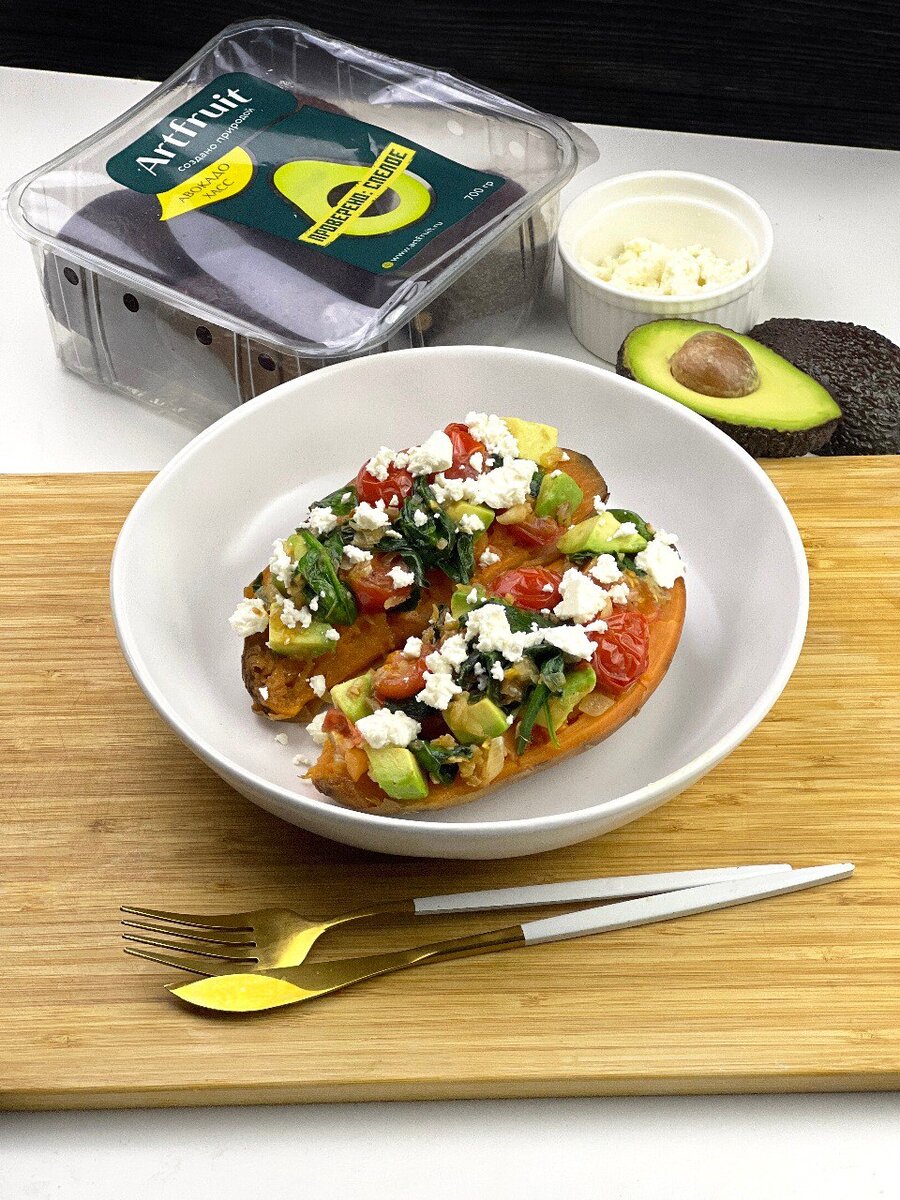 После нескончаемых новогодних салатов хочется чего-то основательного и горячего. Сегодня запекаем батат по этому необычному рецепту. А изюминка рецепта, конечно, спелое авокадо в лучших традициях авокадизма Artfruit. Покупаем на Озоне или в супермаркетах вашего города Ингредиенты: ✔️Батат Artfruit – 2 шт. ✔️Чеснок – 1 зубчик ✔️Лук – 1 шт. ✔️Оливковое масло – 2 ст. л. ✔️Помидоры черри – 10 шт. ✔️Шпинат – 50 г. ✔️Соль и перец – по вкусу ✔️Фета – 50 г. ✔️Авокадо Artfruit – 1 шт. Способ приготовления: 1. Духовку разогреваем до 200°C. Тем временем протыкаем батат со всех сторон вилкой и заворачиваем в фольгу, выкладываем на противень, застеленный бумагой для выпечки, и запекаем около часа 2. Чеснок и лук чистим, режем кубиками и обжариваем на сковороде с оливковым маслом. Добавляем в сковороду черри, порезанные пополам, и шпинат. Хорошо перемешиваем и обжариваем на небольшом огне 3. Авокадо нарезаем кубиками и добавляем к шпинатной смеси. Приправляем небольшим количеством соли и перца. До