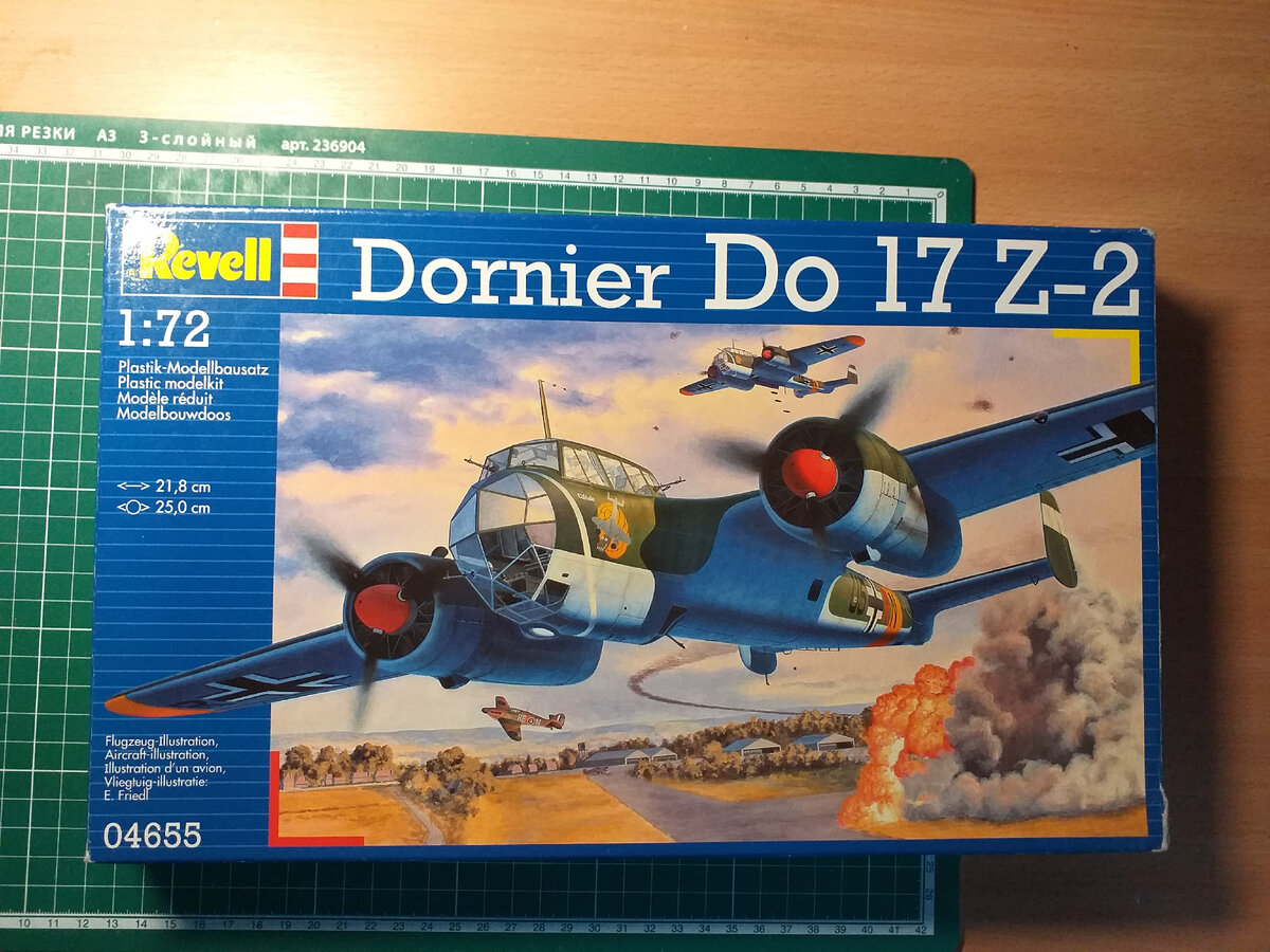 Доброго дня всем читателям и подписчикам моего канала! Сегодня в нашем обзоре - модель немецкого бомбардировщика Dornier Do-17 Z-2 от немецкой же фирмы Revell. Модель досталась мне в довольно потрёпанной, но всё так же приятной на ощупь коробке из глянцевого картона, на лицевой стороне которой - красочное цветное изображение прототипа бомбардировщика. Внутри коробки - полиэтиленовый пакет с литниками. Сразу бросается в глаза достаточно тонкий и из-за этого довольно хрупкий пластик, из которого отлиты детали модели, в связи с чем они требуют повышенной осторожности при обращении с ними. Расшивка на модели - наружная, вероятнее всего, в силу уже не молодого возраста модели. Судя по инструкции, модель выпущена в далеком 2011 году. Необходимо отметить, что инструкция отпечатана достаточно подробно и качественно, а среди прочих языков, на которых нам даётся описание, присутствует и русский! Отдельного внимания заслуживают две пары деталей, отлитых очень качественно и высоко