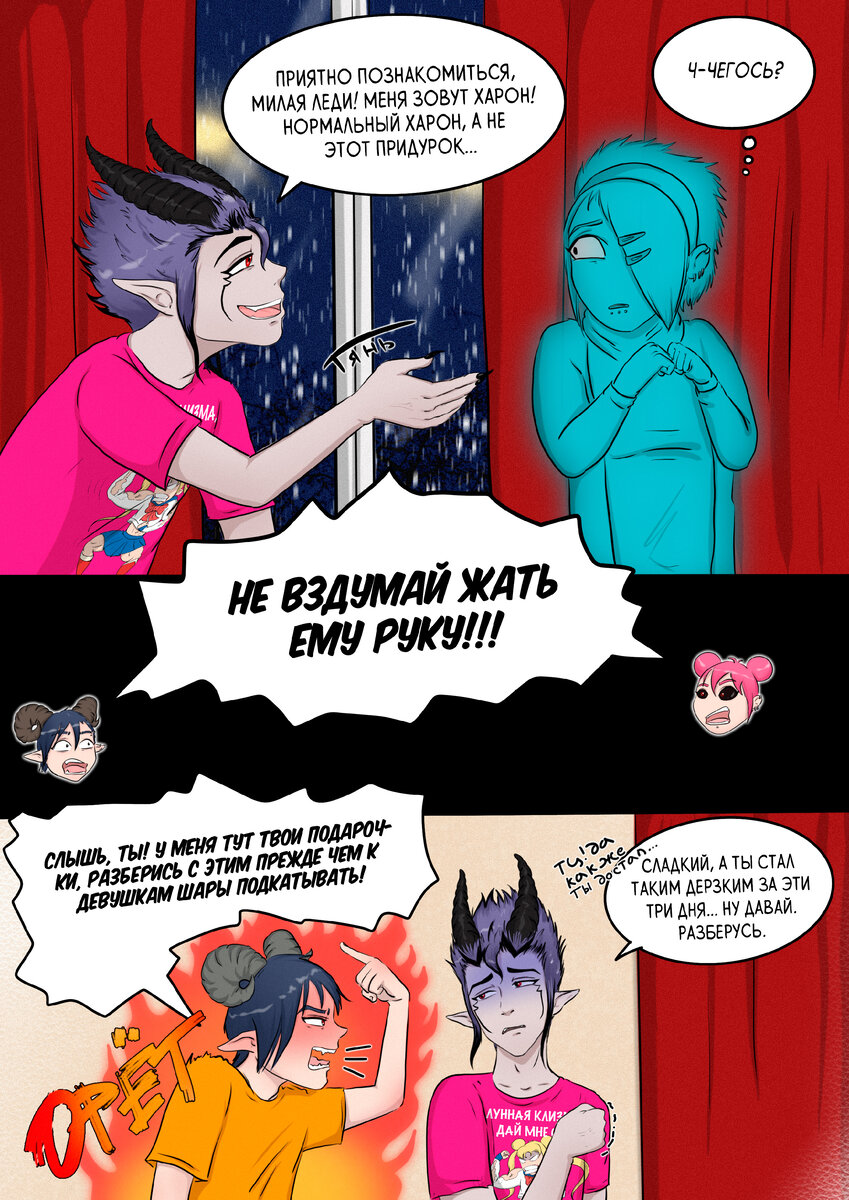 Ну что, товарищи... Спасибо, что вы всё ещё с нами! У меня вообще время не особо простое, но буду продолжать рисовать по мере сил (моральных и физических). Не так часто как раньше, нов сё же... Итак, тут смесь редрава из старой рисовки (так как надо продолжить арку и ввести в сюжет Кляксу для склейки со следующей частью) и арки про рога (от которых наш Хароша наконец избавился, ибо меня уже заколебало их рисовать xD ). И да, теперь будет новый формат вёрстки, так как многие сидят со смартфонов и это будет удобней, я думаю...