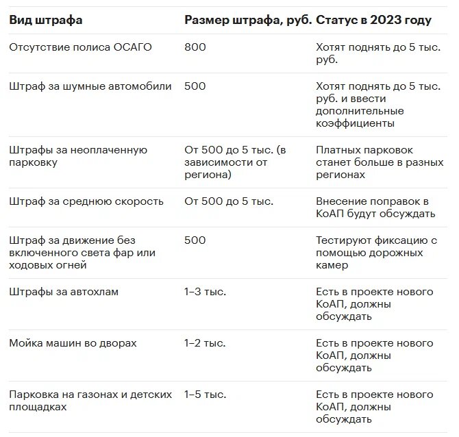 Штрафы за езду без ОСАГО хотят поднять, за шум от автомобиля придется заплатить в десять раз больше, а средняя скорость может вернуться: какие новые наказания ждут водителей в 2023 году, смотрите в таблице ниже: