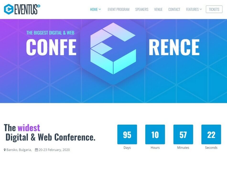 Eventus - это чистый и современный шаблон Joomla! 3.X, ориентированный на события, номер 1 по продажам шаблонов на Themeforest. Eventus поставляется с 8 выделенными главными страницами.