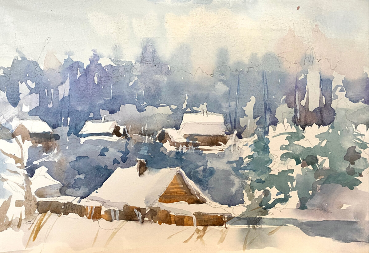 Такой итог сегодняшней вылазки. Приехала на высокий берег реки. С одной стороны - деревенька, с другой - сосны. Поставила себе задачу не сходя с места найти четыре повода для картинки. Сначала - вот такой дом под склоном и деревенька с противоположной стороны реки. Дом этот рисую уже не в первый раз - очень он мне симпатичен. С этой стороны реки он единственный, и даже непонятно, жилой ли. Развернулась в другую сторону - сосны большие и сосновый подлесок и березки на пригорке. Чуть перевела взгляд- те же сосны и дома за дорогой. Дело уже к закату, поэтому, несмотря на сумрачный день, видна тёплая полоса на небе у горизонта. И этюд с тремя березками и елью. Времени на все четыре картинки - полтора часа. Бумага - дешевая целлюлоза. Никаких трюков, как с хлопком, с ней не получается. Письмо максимум в два слоя.