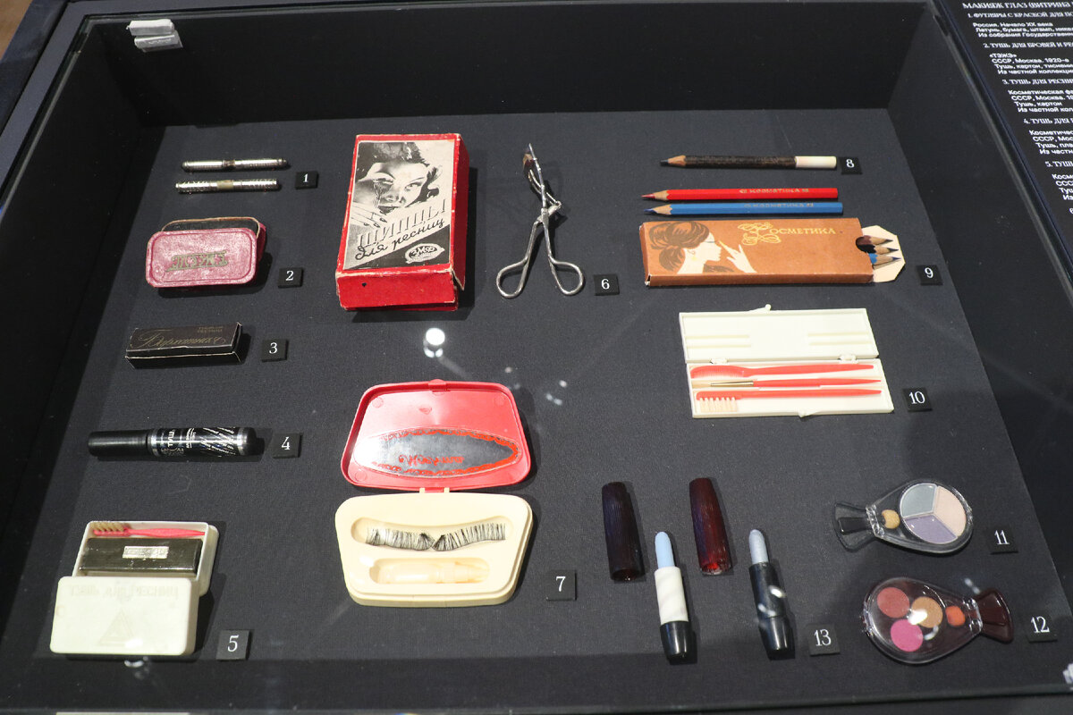 На выставке «Кринолин. Жакет. Свитшот» в Историческом музее в Москве, о которой я уже не раз писала, был отдельный стенд под названием «Салон красоты». И там оказалось так забавно! В витринах представлена косметика и всякие женские приспособления для красоты за последние 100 лет. И сколько же там странного, хотя есть и кое-что знакомое. Например, такой твердой тушью пользовалась моя бабушка, и пудра Театральная тоже у нее была, я даже до сих пор помню запах. И тюбики с кремом я тоже помню с детства, и помада тоже есть знакомая. Рассматривать все это очень интересно. Удивляют накладные ресницы в коробочке, интересно, на что их клеили? Маникюрные принадлежности больше похожи на инструменты хирурга. А уж про приспособления для завивки волос я и вообще молчу – точно какие-то средства для пыток! Подобная плойка была у моей мамы и почему-то при взгляде на нее я вспоминаю запах жженых волос. И невидимки со шпильками я тоже помню именно в таких упаковках. Даже не ожидала, что столько всего в