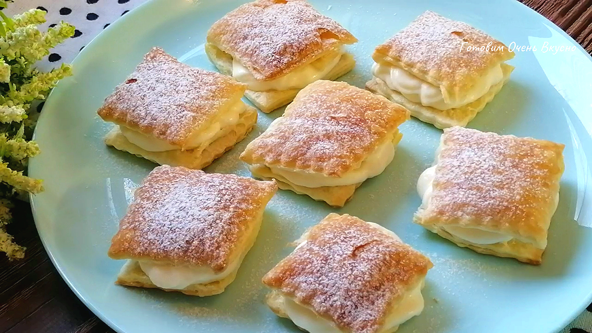 Друзья, а это рецепт воздушных и очень вкусных мини-пирожных. Для экономии времени будет использовать готовое слоеное тесто. Пирожные получаются ну очень вкусными! Подробный видео рецепт и список продуктов для приготовления можно посмотреть в конце статьи ⤵️ Итак, готовим воздушные пирожные из слоеного теста 👩🍳 1. Приготовим заварную основу для крема. Для этого в ковше с толстым дном соединим сахар, крахмал, ванилин, яйцо и немного молока. Хорошо перемешаем венчиком чтобы не было комочков. Вливаем оставшееся молоко и еще раз перемешиваем. 2. Ставим ковш на средний огонь и варим постоянно помешивая до закипания. 3. Снимаем заварную основу с огня, накрываем пленкой в контакт, даем остыть до комнатной температуры и убираем в холодильник. 4. Слоеное тесто нужно заранее разморозить. У меня два пласта теста общим весом 500 гр. Если пласт теста слишком толстый, то нужно его слегка раскатать, сразу на пергаменте для выпечки. 5. Делим тесто на равные квадраты 4*4. 6. Выпекаем в заранее р