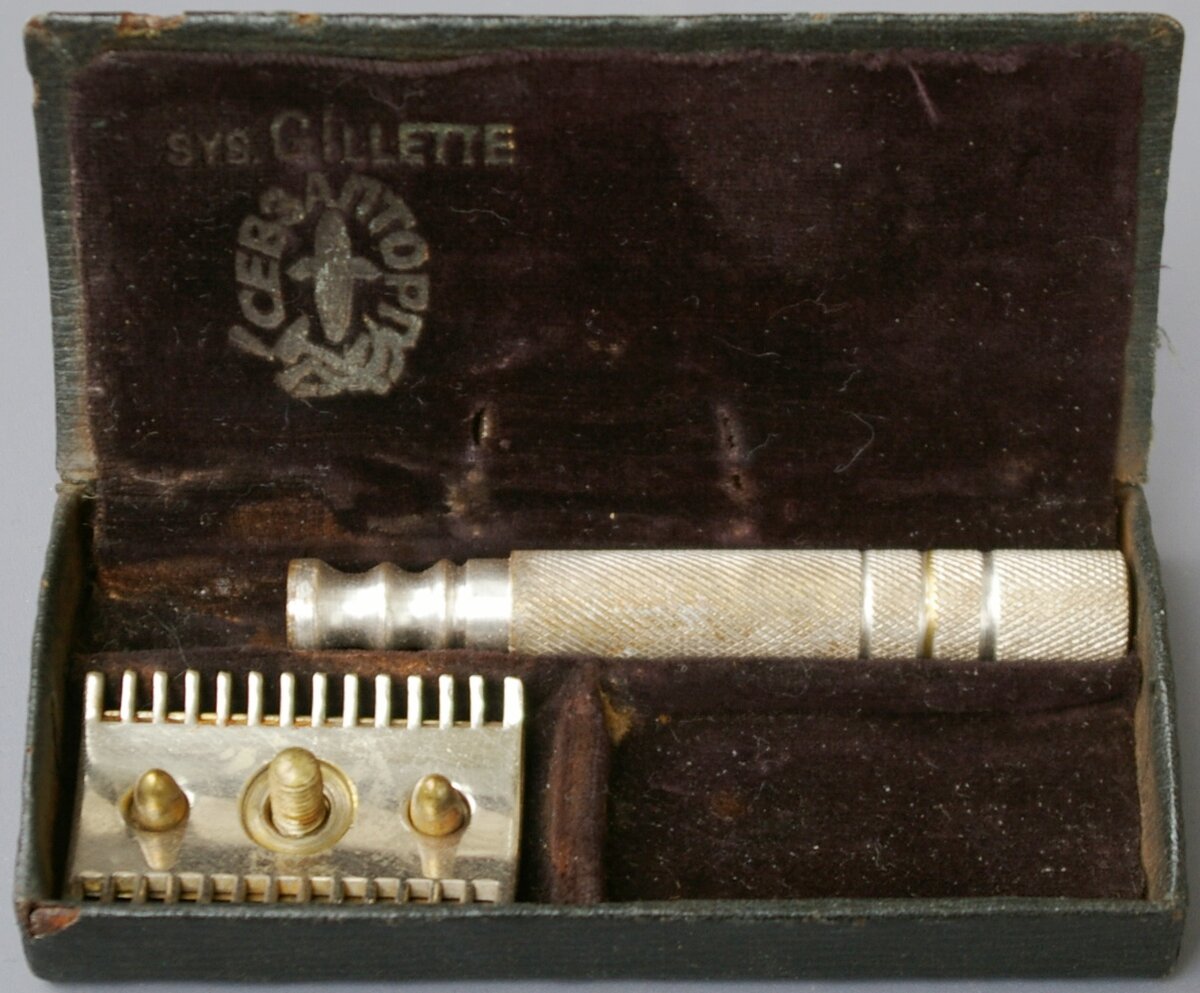 Бритвенные приборы в футлярах с логотипом "Севзапторг". Помню, как они мне достались. "Чёрный" купил в давно закрывшемся антикварном магазинчике "Larusse" на Стремянной улице, "красный" - на Удельном рынке. Акционерное общество "Севзапторг" с основным капиталом в 2 миллиона рублей было по сути крупным торговым посредником, по-старому "торговым домом". А эти бритвенные приборы, видимо, были заказаны для представительских целей в качестве фирменных сувениров. Производитель бритв не известен, однако, словосочетание "sys. Gillette" над логотипом наводит на мысль о московском инженере Каждане, любителе этого ласкающего ухо словосочетания. Подарок питерского коллекционера Виктора Воронкова. Бритвенный прибор Киевского фурнитурного завода, 1940 год, точная копия изделия компании "American Safety Razor". Конструкция запатентована еще в 1912 году. Эти бритвы выпускались в США и Англии под именами "Star", "Gem" и "Ever-Ready". Заранее заложенный в концепцию украинского прибора просчёт - абсолютн