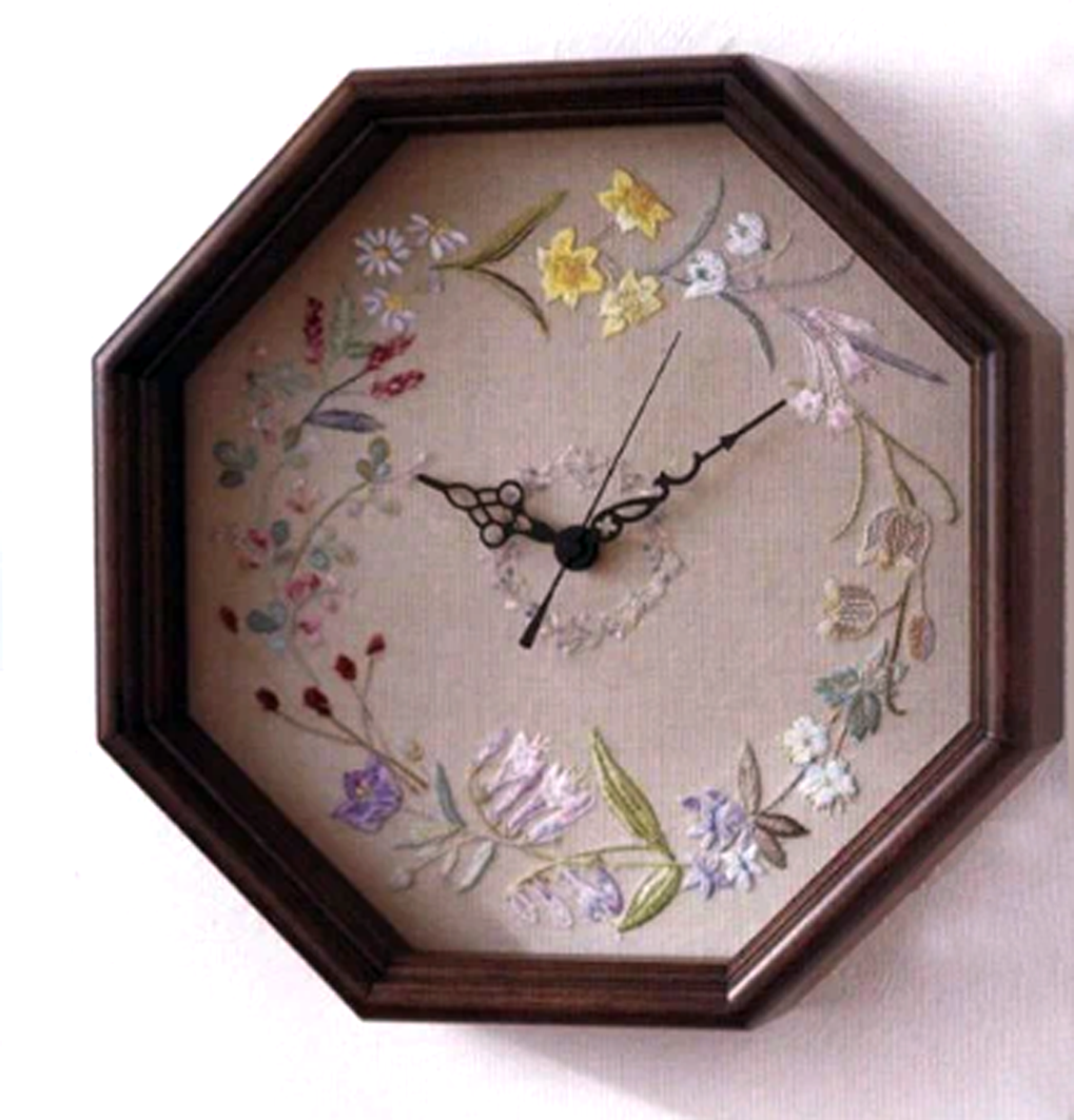 Конечно, говоря об авторских настенных и настольных часах я имею в виду вышитые часы, точнее циферблат. Механизм для часов можно купить в магазине и в нем нет никакого авторства. Для начала посмотрите часы, вышитые разными мастерицами. Обратите внимание как по разному расположена вышивка на циферблате. В качестве циферблата может служить вышивка, ее даже не нужно снимать с пялец. Главное, чтобы вся картина помещалась внутри окружности. Края ткани нужно подогнуть на изнаночную сторону и аккуратно спрятать. В центр вышивки (а иногда и сбоку!) закрепить часовой механизм и стрелки. Как выбрать часовой механизм? Это основной элемент, без которого сделать часы невозможно. Можете достать его из старых часов, либо купить отдельно. Кварцевые механизмы сегодня устанавливают практически во все недорогие настенные и настольные часы. Работают они от одной пальчиковой батарейки размера АА. Если «сердце» часов поломается, его запросто можно заменить. Единственное условие – чтобы подходили стрелки. С