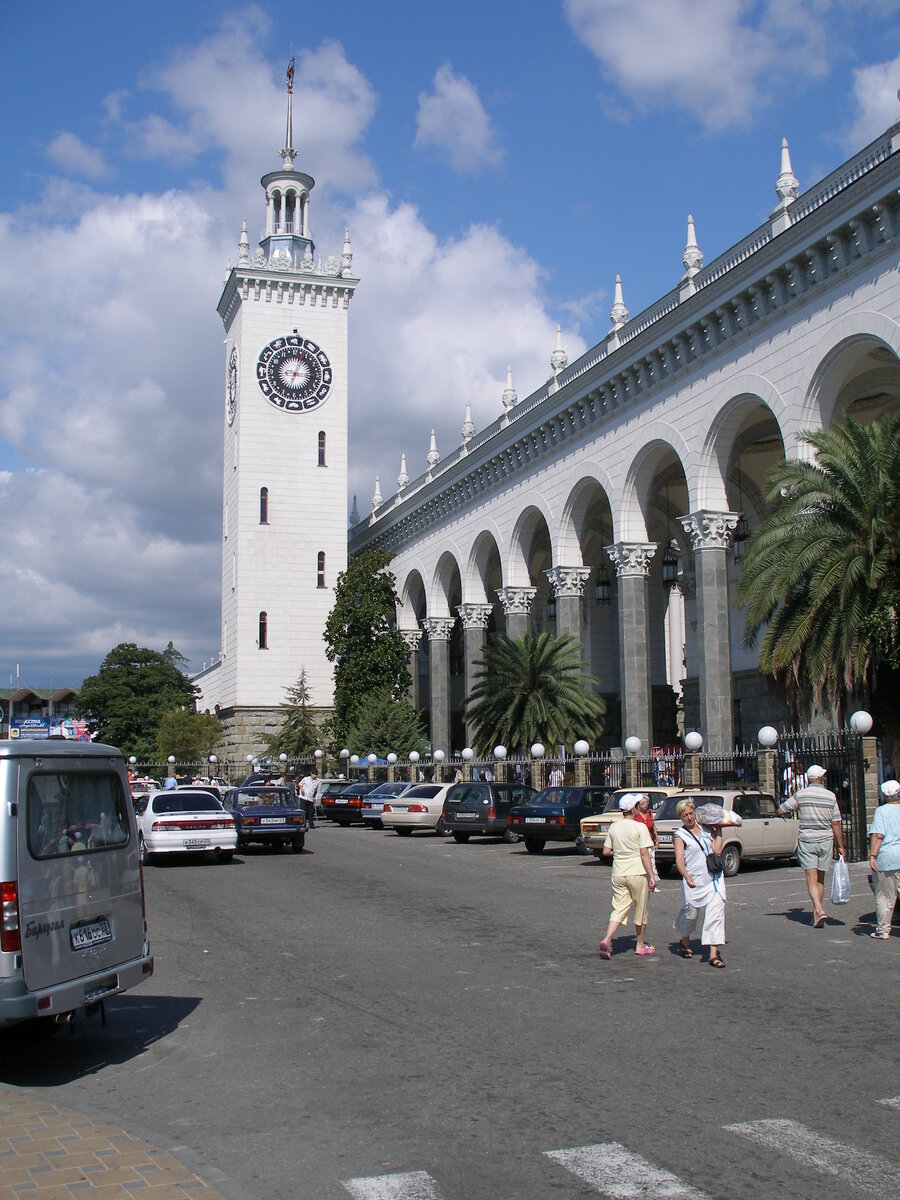 Первое, что видят путешественники, приезжающие в город на поезде, это вокзал. Вокзал города Сочи очень запоминающееся и красивое место, символ города. И его не даром изображают на открытках, магнитах и фотографиях. Место для вокзала в Сочи было определено в 1913 году. Но первое здание (деревянное) было построено только в 1923 году. В 1939 году на месте первого вокзала был возведен другой. А в 1947 году началось проектирование нового вокзала. Автором проекта стал А.Н. Душкин. Новый вокзал был торжественно открыт 10 сентября 1952 года. Но его строительство сопровождалось преодолением многих трудностей. Начиная от утверждения проекта и заканчивая сложностями при строительстве. Но несмотря на это, здание вокзала имело высокие оценки архитекторов и органично вписалось в Кавказский ландшафт. Здание представляет собой сложную архитектурную композицию с часовой башней и тремя двориками в виде атриумов со скульптурой и фонтанами. Впечатление возвышенности и воздушности создают высокие арки