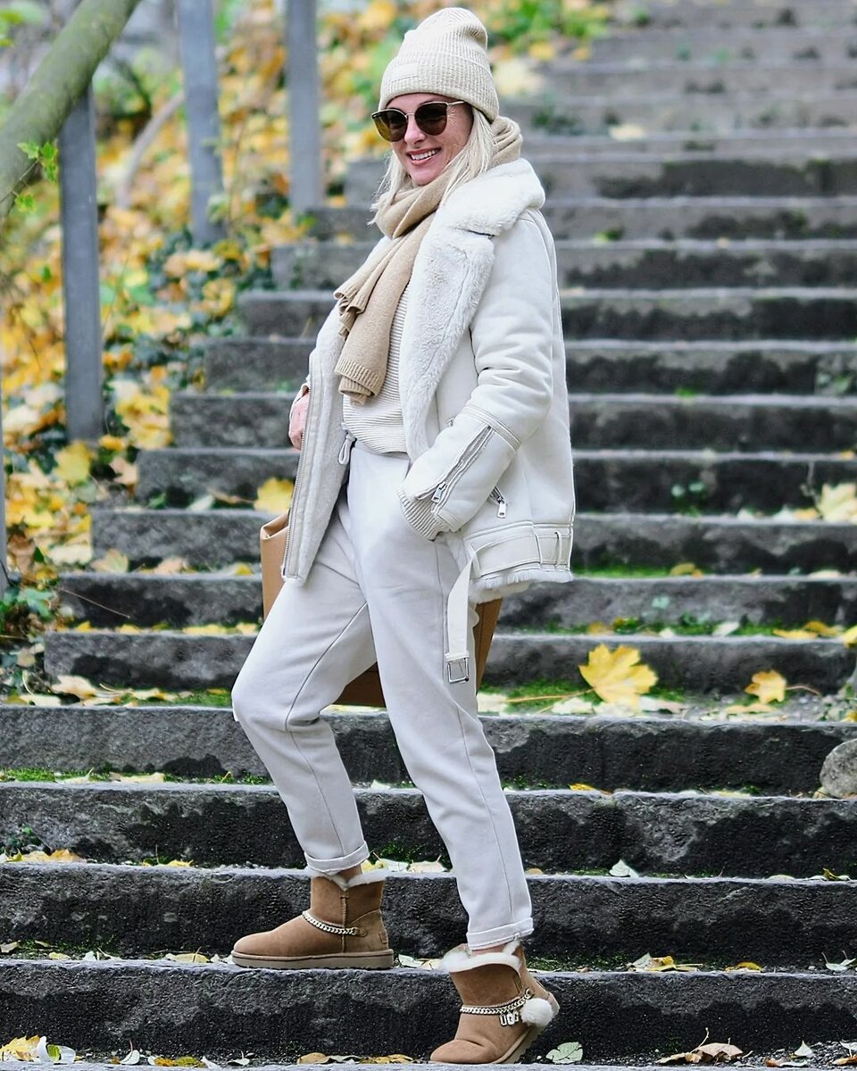 Дубленки обеспечивают надежную защиту от мороза, ветра. При грамотной стилизации, они смотрятся не менее элегантно, чем шерстяное или кашемировое пальто. Сегодня разбираемся, как носить дубленку в возрасте 50+, чтобы выглядеть по последней моде. Дубленка молочного цвета освежает внешность женщины и образ в целом. Чтобы усилить этот эффект, можно соединить ее с одеждой в светлых тонах. Удлиненная дубленка еще лучше защищает от зимних морозов. Комплект в кремовом цвете не помешает "разбавить" яркими деталями в виде желтых перчаток, морковного шарфа и вместительной сумки. Дубленка прекрасно сочетается с женственными предметами гардероба. Это может быть юбка миди, трикотажное платье. Высокие сапога и объемный шарф дополнительно утепляют образ. Свитер + брюки с подворотами + дубленка – будничный и в то же время стильный повседневный сет. В данном случае кеды стоит заменить на ботинки на низком ходу или утепленные кроссовки. Не хуже на зрелой женщине смотрится цветная дубленка. Модель синег