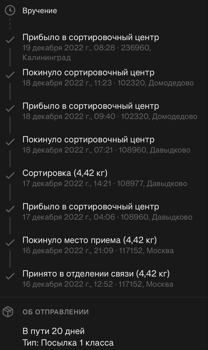 Всем добрых суточных времён. Случилась некая оказия на наших просторах северо-западного округа, почта России решила категорически не работать, ну или работать никак. Дано: посылка отправленная первым классом (стоимостью х2 от обычной стоимости отправки). срок доставки (мин-макс 1-3 дня, простая 2-4). Посылка действительно приехала за 3 дня в город назначения на сортировочный центр, а дальше... Не нужна вам посылка, пусть полежит на сортировке.