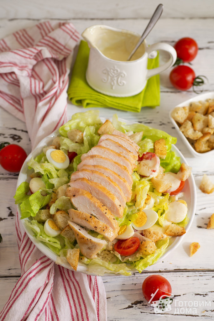 Бонусом даю рецепт идеально нежной и сочной куриной грудки. Ее предварительно даже мариновать не нужно, главное, не пересушить в духовке- как только готова, сразу доставать. ИНГРЕДИЕНТЫ куриная грудка (филе) 200-300 г салат Айсерг или Романо (romaine lettuce) 150-200 г помидоры черри 8-10 шт перепелиные яйца 6-8 шт оливковое + сливочное масло для жарки соль свежемолотый перец Для гренок багет (или белый хлеб) 4-6 ломтиков масло оливковое 1 ст.л. чеснок 1-2 зубчика соль
