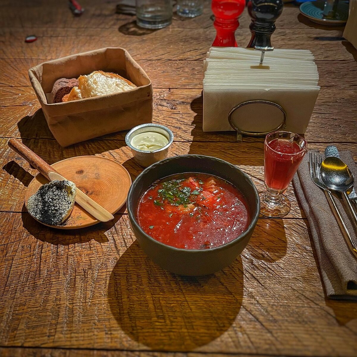 Наверное, самый вкусный борщ, который я ел в ресторанах. Борщ с пастрами из говядины и копчёной грушей из меню московского ресторана «Горыныч» по 590 ₽. Подают со сметаной. В качестве комплемента приносят взбитое сливочное масло с четверговой солью и три вида хлеба: белый, серый и бородинский. Хлеб пекут здесь же в ресторане, в специальной печи. Поэтому хлеб ещё тёплый. Четверговая соль у нас уже не диковинка, но здесь удивил необычный деревянный нож, слеланный из ветки. Он идёт к маслу. Оригинально. Подача блюда выглядит просто: чугунок с борщём и плошка сметаны. Важный момент. В составе борща нет картофеля. Вначале попробовал борщ без сметаны. Очень такой плотный и с характерным для хорошего борща вкусом. А вот когда добавляешь сметану, тут происходит чудо. Борщ становится чуть сладковатым, открывается вкус копчёной груши и вот эта приятная нота, в сочетании с пастрами, поднимает борщ на новую высоту. Это очень вкусно. Не знаю, есть ли где в Новосибирске борщ, хоть немного по