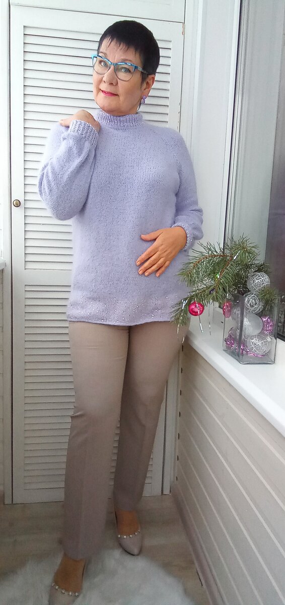 Модель А-силуэта подойдёт почти для любой фигуры. Она скрывает недостатки женской внешности. Особенно советуют стилисты носить такие вещи обладательницам фигуры "груша" или "песочные часы". Вот такой моделью создаем привлекательный и женственный образ. Девушки которые любят носить брюки, это идеальная модель. Пряжа "Пух норки" в одно сложение плюс две дополнительные нити. Расход 220 грамм. Пряжа с пайетками на вискозной нити. Расход 30 грамм. Спицы N 3,5. На резинку N 3. Буду благодарна обратной связи.