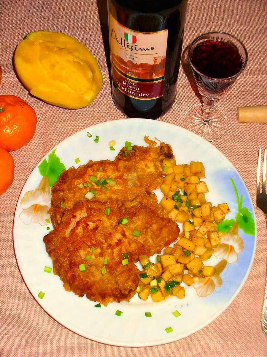 Отбивные из свинины с сальсой из манго и яблок. Свиной ошеек, готовый к кулинарной обработке, нарезать порционно, на кусочки, толщиной 5 - 7 мм. Мясо отбить специальным молотком, с двух сторон. Посолить, поперчить. Яйцо слегка взбить вилкой. Отбитое мясо сначала обмакнуть в яйцо, а затем в муку. Обжарить с двух сторон, на растительном масле, до золотистой корочки. Подавала с сальсой. Сальса из манго - одна из самых любимых. Манго в наших магазинах продают такой степени спелости, что назвать этот плод фруктом - язык не поворачивается) Овощ, как есть овощ) Манго ( половинку) нарезать мелким кубиком. Крупное кисло - сладкое яблоко почистить, взять 1/4 часть, нарезать мелким кубиком. Сложить манго и яблоко в удобную посуду, добавить сок мандарина ( 1 шт), бальзамический соус - крем ( на кончике ложки), зерновой горчицы - на кончике ложки, чайную ложку кунжутного масла, свежемолотый черный перец, 1 перо зеленого лука ( мелко порезать). Перемешать и дать настояться 10 - 15 минут. Приятно
