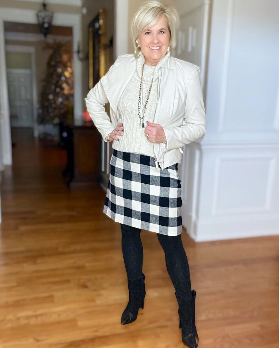 Зимой нам так не хватает красок, поэтому стоит сделать более красочным свой гардероб. Тем более что есть сочетания цветов, которые всегда выглядят дорого и красиво. В своих образах можно использовать и классические, и неожиданные сочетания. Приведу несколько примеров стильных образов. Начнем с классики, которая всегда актуальна. Молочный + черный Сочетание белого и черного – это классика. Но белоснежный идет не всем, а вот более мягкий молочный оттенок выглядит не менее дорого и благородно и прекрасно сочетается с черным цветов. При составлении ансамбля светлые оттенки располагаем ближе к лицу, а черный смещаем ниже пояса. В примере представлено сочетание свитера молочного оттенка и прямой юбки из ткани в черно-белую клетку. Ансамбль дополняет короткая куртка в тон свитеру, плотные черные колготки и черные полусапожки. Чёрный + красный Еще одно контрастное классическое сочетание, которое позволит создать яркий образ. Не бойтесь носить красное, этот цвет идет всем, нужно только найти по