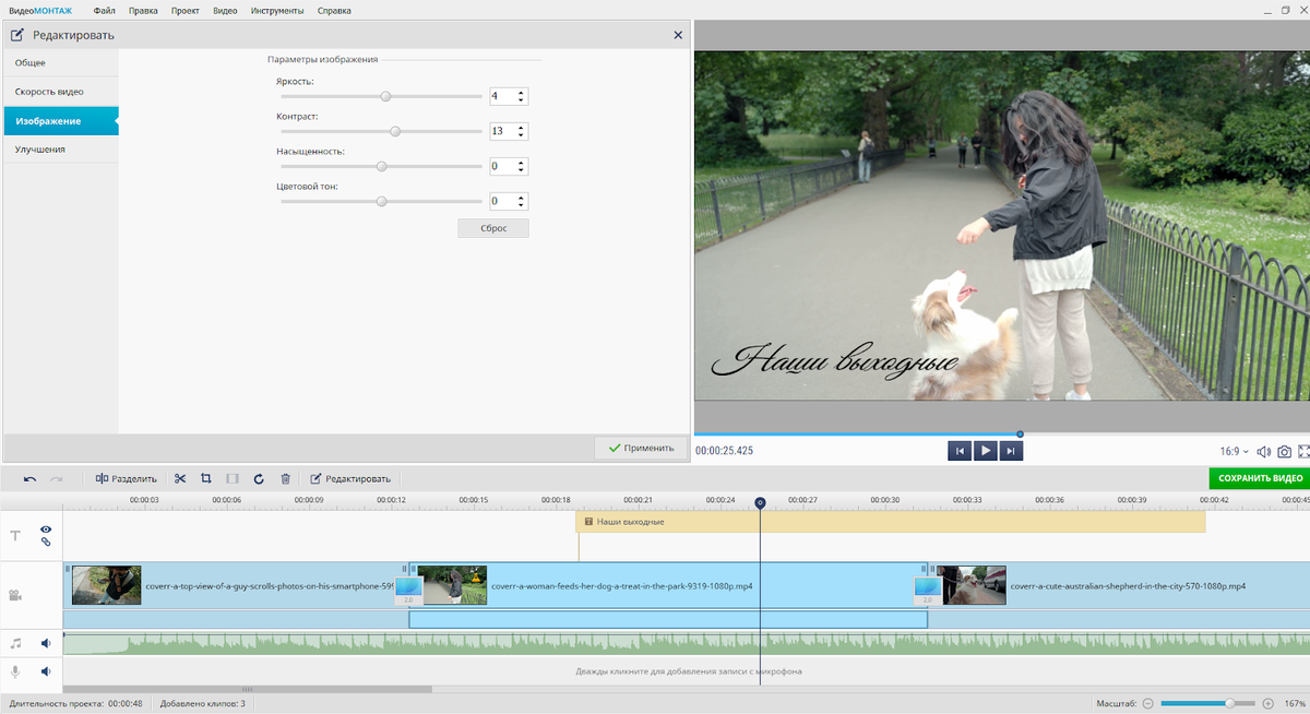 Условно-бесплатная программа для видеомонтажа, которая подойдет профессионалам и любителям. С этим редактором работают даже монтажеры в киноиндустрии, выполняя постобработку полнометражных фильмов и сериалов. ПО содержит готовый набор фильтров и анимированных переходов, позволяет работать со слоями и многочисленными дорожками. С помощью инструментов цветокоррекции легко менять тон, настраивать баланс оттенков, превращать цветное видео в монохромное.