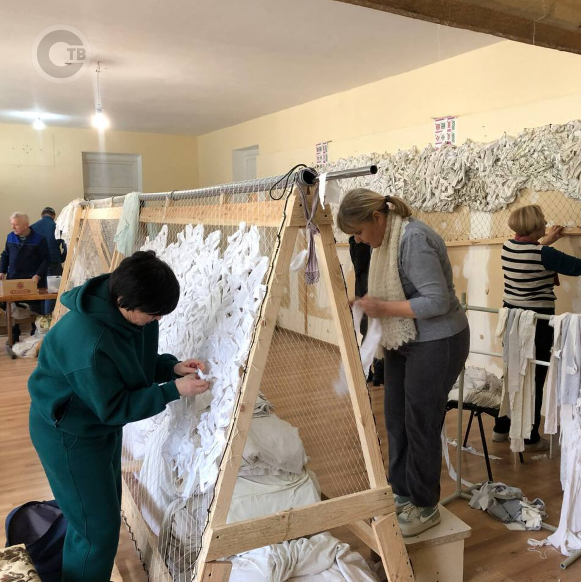 Все желающие могут принести в волонтерский штаб материал для плетения сетей — это длинные лоскутки около 2 сантиметров шириной, сейчас добровольцам для работы не хватает ткани природных оттенков.