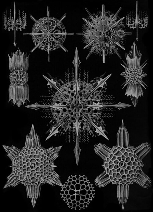 Радиолярии, они же Radiozoa - простейшие размером 0,1 - 0,2мм, обладающие неимоверно красивыми кремневыми скелетами. Глядя на них тяжело поверить в то, что в микромире можно увидеть такую красоту, а ведь поди ж ты!) *-* (Полистайте галерею) Поразительно то, что у некоторых радиолярий имеется около 1500 хромосом 0_0 У нас вот с вами их всего 46….. 🤯 Простейшие эти являются гетеротрофами и питаются мелкой, плавающей в толще воды органикой, улавливая ту своими длиннющими иглоподобными ложноножками. Некоторые радиолярии наловчились захватывать себе в помощники водорослей, например динофлагеллят или гаптофит, чтобы те делились с ними синтезированной органикой. 🌿 В течение жизни они парят в толще воды за счёт липидных капелек в своей эктоплазме и за счёт лучеподобных ложноножек, а, умерев, падают на дно, образуя радиоляревый ил. Постепенно, накапливаясь, этот ил может переходить в кремниевые породы - опоки или яшмы. ✨ 🧐 Радиолярии - любимые маркеры смены исторических эпох для па