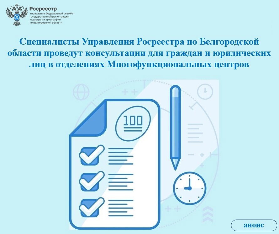 Специалисты Управления Росреестра по Белгородской области проведут консультации для граждан и юридических лиц по вопросам осуществления государственной регистрации прав и (или) постановки объектов недвижимости на государственный кадастровый учет:
