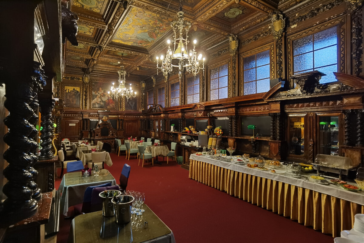 Друзья, в своей недавней заметке, где я начал рассказывать про Дом Бильдерлингов на Большой Морской улице, обещал вам показать все живописные панно близко. Поэтому сегодня данное обещание исполню. Для начала напомню как выглядит парадный зал. Это помещение украшает 12 живописных панно на тему немецких сказок, расположенных по периметру зала. Также одно находится на потолке. Сюжеты были созданы в 1880 года. Как пишут в интернете, в 1930-е годы частично утраченные живописные панно были заменены. Видимо, в то время здесь шли реставрационные работы (техника: холст, масло; размеры: 110х85 см. и 150х135 см.) Потолочное панно «Белоснежка и семь гномов» - изображена сидящая женщина в шляпе с перьями, вокруг неё гномы, один из которых протягивает ей поднос с фруктами. Остальные панно располагаются на стенах по периметру зала. Панно «Мальчик-с-пальчик» - изображен усатый великан, сидящий в кресле, в окружении лилипутов Панно с сказочным сюжетом с изображением трех девушек, одна из которых игр