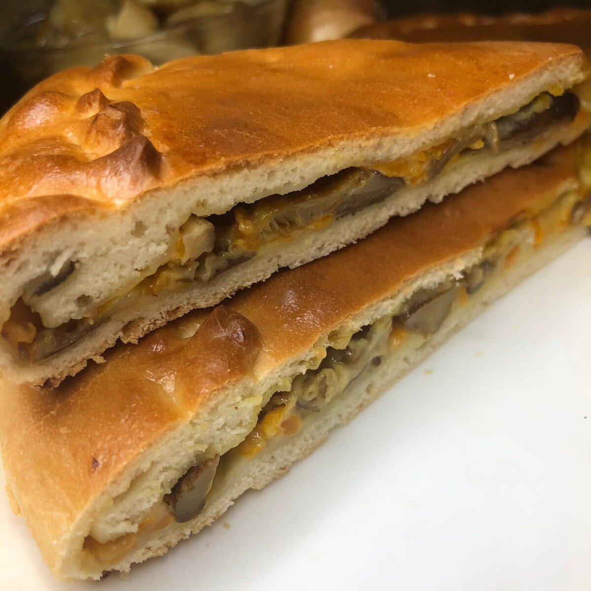 Слегка протушить муку со сметаной, добавить нарезанные грибы, посыпать зеленью укропа. Из теста раскатать 2 лепешки. На одну выложить ровным слоем начинку, накрыть другой лепешкой, защипнуть края. Смазать яйцом, посыпать панировочными сухарями, проколоть в нескольких местах вилкой и выпекать в очень горячей духовке 20–30 минут.