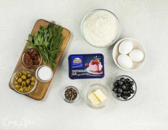 перец черный - 1по вкусу Шаг: 1 Эти ингредиенты понадобятся для приготовления. Шаг: 2 Сливочное масло соедините с яйцом. Шаг: 3 Добавьте соль и муку. Шаг: 4 Замесите тесто, затем скатайте его в шар, заверните в пленку и поставьте в холодильник на 30 минут. Шаг: 5 Оливки и вяленые помидоры нарежьте небольшими кусочками. Шаг: 6 Укроп и петрушку мелко порубите, соедините все в глубокой чаше. Шаг: 7 В ту же чашу разбейте два сырых яйца. Шаг: 8 Добавьте творожный сыр Hochland «Для кулинарии», перемешайте. Начинка готова. Шаг: 9 Тесто раскат