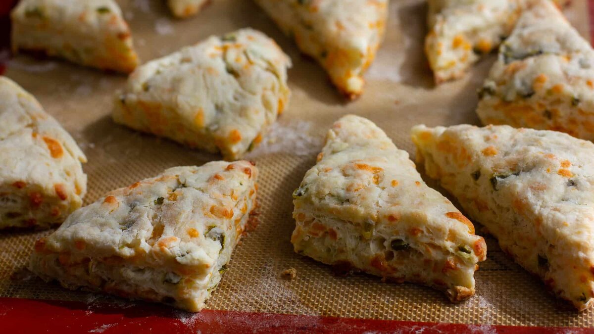 Добавьте холодное сливочное масло в миску и с помощью кондитерского блендера измельчите сливочное масло в муку. Продолжайте до получения рассыпчатой консистенции. Добавьте тертый копченый сыр чеддер и измельченный маринованный перец халапеньо.
