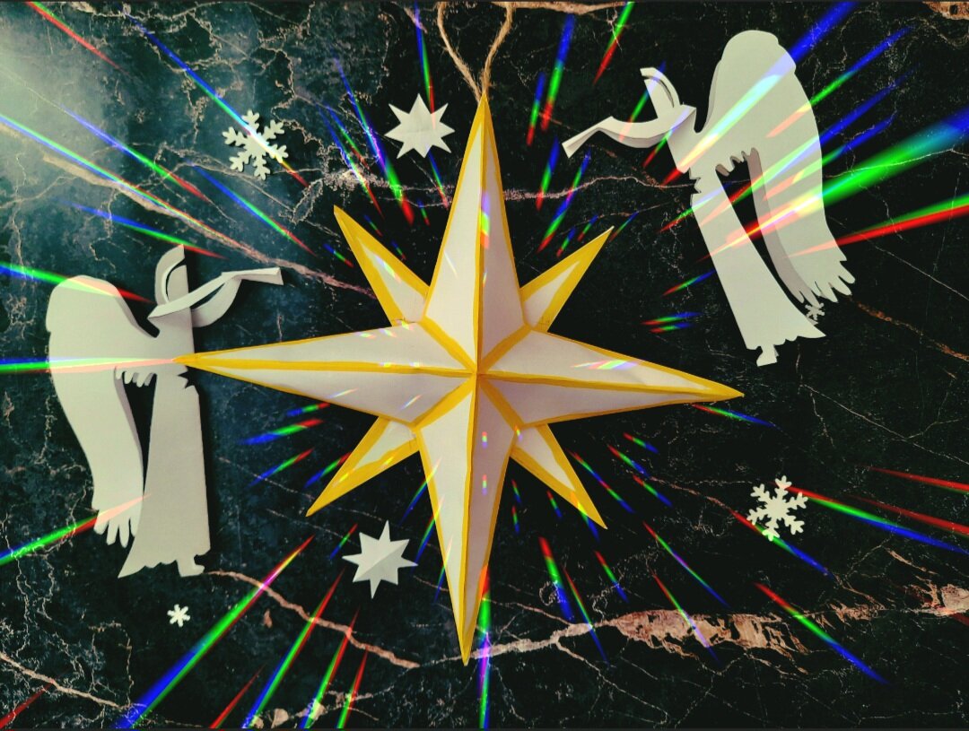 Вифлеемская звезда - один из главных символов Рождества. Она появилась на небе за много дней до Рождения Христа. Согласно древним предсказаниям звезда возвещала о Рождении Владыки всего мира. А затем она указывала путь волхвам целых 40 дней, пока они шли с дарами к младенцу Христу. Звезду принято изображать восьмиконечной. Часто соседние лучики имеют разный размер. Такими звёздочками принято украшать макушку рождественской ёлки. Пятиконечные звезды появились уже в советское время. А теперь возвращаются восьмиконечные. Давайте и мы сделаем такую звёздочку накануне великого праздника, тем более, что это совсем несложно. Я видела, как подобные звезды накануне Рождества несли в руках дети, обучающиеся в православной воскресной школе. Нужна офисная бумага 1,5 листа формата А4 и клей. Я Я ещё использовала акварельные краски для оформления. Начинаем работу с изготовления квадратов со сторонами 21 и 15 см: один делаем из целого листа А4, второй - из п