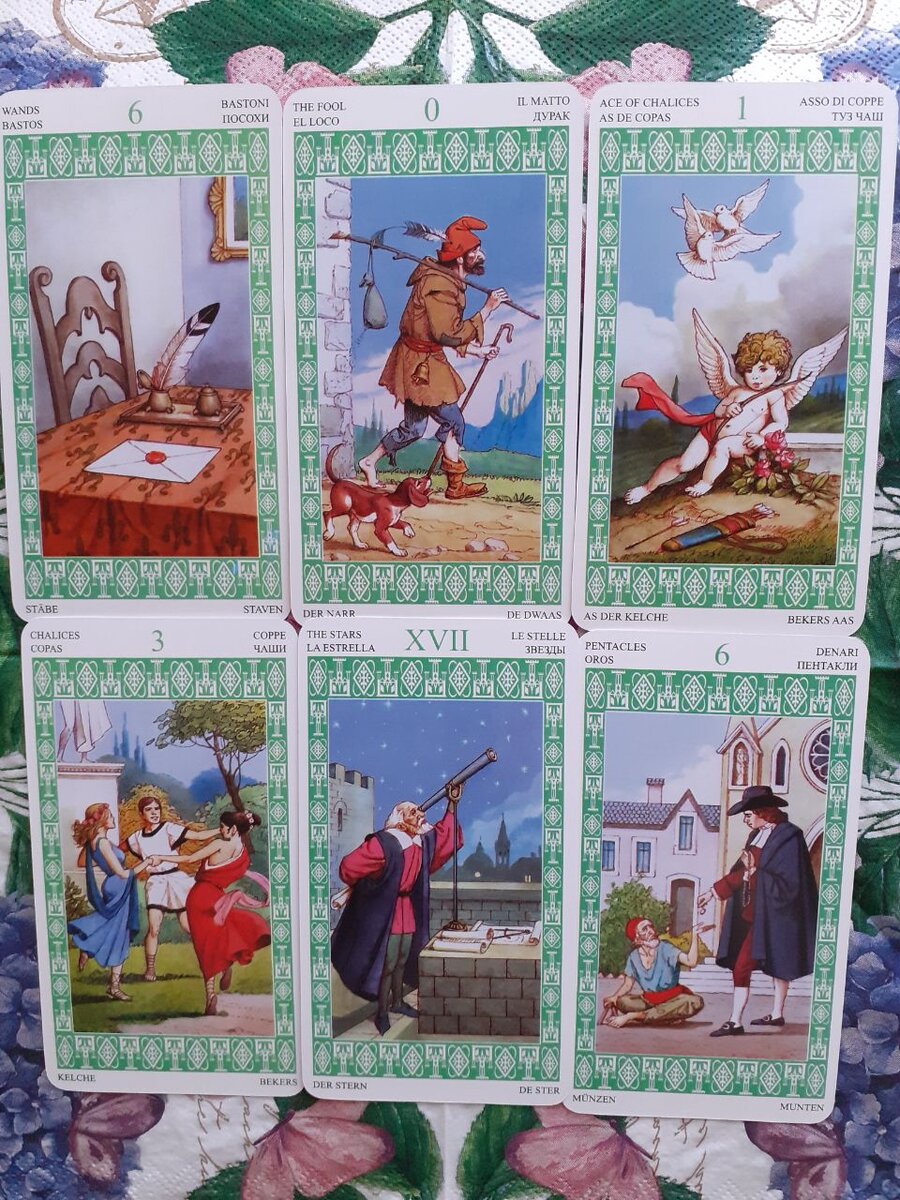 Вас действительно ждут хорошие новости! Об этом говорит карта Шестёрка жезлов. А также триумф, заслуженная победа, успех! Кто хорошо работал, тот получает признание, в этом заключается преимущество знания того, чего Вы хотите, и объявление этого во всеуслышание! Празднуйте свой успех, Вы добились того, чего хотели, а остальные стоят позади Вас!... Когда в раскладе появляется Дурак, пришло время для чего-то нового! Как Вы начинаете любое жизненное приключение — будь то новая работа, или новые отношения, - дело вкуса. Возможно, Вы берётесь за любое дело с волнением и искренним удивлением — Дурак полон оптимизма, надежды и желания исследовать что угодно непредвзято. Прямое значение этой карты — чистый лист и замечательные перспективы! Если Вы не можете решиться на отчаянное предприятие, прямой Дурак, выпавший в раскладе, советует Вам взяться за него. Эта карта может также выпасть, если Вы закончили один проект и собираетесь приняться за другой. Совет — Рискните! Начните что-то новое с лё