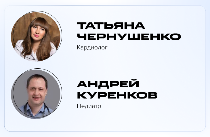 Приглашенные эксперты: кардиолог Татьяна Чернушенко (к.м.н., окончила Кемеровскую государственную медицинскую академию, работает в поликлинике №52 г. Москва), педиатр Андрей Куренков (к.м.н., окончил Рязанский государственный медицинский университет, детский медицинский центр «Начало» и клиника «Рассвет»)