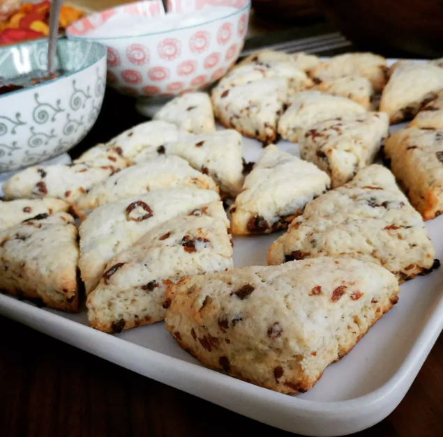 2. Смешайте муку, сахар, разрыхлитель, соль и пищевую соду в средней миске. Натереть масло в мучную смесь на крупной терке. Пальцами перемешайте масло, пока смесь не станет напоминать крупные крошки, затем добавьте изюм.