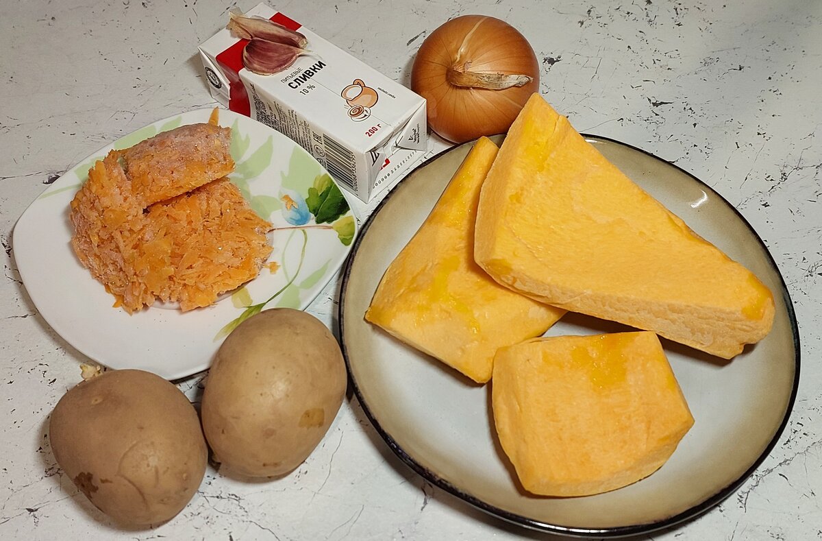 Надеюсь, вы уже наелись салатов и готовы устроить своему организму очень вкусный, разгрузочный день. Для рецепта нам понадобится: Тыква 500 гр Лук репчатый 1 шт Морковь 1 шт Чеснок 1-2 зубчика Картофель 2 шт (средний) Сливки 10% - 200 мл Вода 250- 300 мл Сливочное масло для жарки Соль, перец, мускатный орех по вкусу. Ставим на плиту кастрюлю с толстым дном, закидываем туда кусочек сливочного масла, лук, морковь, чеснок и специи. Лук я нарезала небольшими кубиками, а морковь у меня натертая на крупной тёрке. Обжариваем овощи на небольшом огне примерно 2- 3 минуты. Затем добавляем в кастрюлю картофель и тыкву порезанные на небольшие кубики (примерно 2×2 см). Обжариваем все 1-2 минуты и заливаем кипятком так, что бы водой покрыть почти все овощи. Оставляем вариться под крышкой, на медленном огне примерно на 15- 20 минут(до полной готовности овощей). Когда овощи будут готовы, снимаем кастрюлю с плиты и пробиваем погружным блендером до однородности. Возвращаем кастрюлю обратно на плиту,