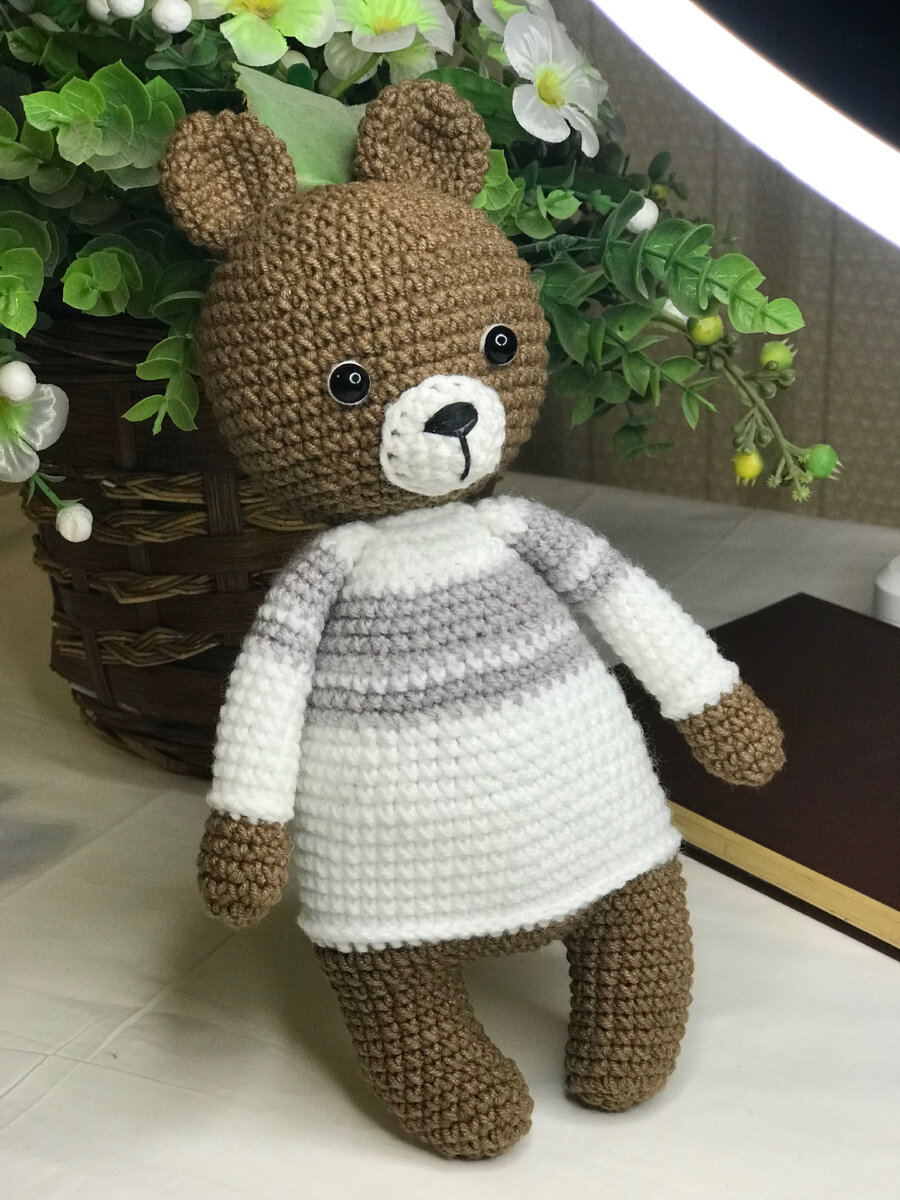 Добро пожаловать на мой канал, где я делюсь уроками по вязанию и своими работами😍 Сегодня хочу поделиться схемой, по которой связала данного медвежонка 🧸 Буду рада, если подпишитесь на мой канал и оцените этот материал. Благодарю ❤️ Приступаем к работе Для вязания игрушки я использовала: Для начала вяжем все необходимые детали: голова, ушки носик и ручки. Затем приступим к ножкам, а от ножек перейдём к вязанию самого туловища для нашего мишутки. Голова: Первый ряд: 6 столбиков без накида (далее сбн) в кольцо амигуруми Второй ряд: 6 прибавок (далее пр), то есть по два столбика без накида в каждую петлю. Итого получаем 12 столбиков Третий ряд: (1сбн и пр) повторяем комбинацию 6 раз. Итого получаем 18 столбиков Четвертый ряд: (2сбн и пр) * 6 повторений. Итого 24 столбика Пятый ряд: (3сбн и пр) * 6 повторений. Итого 30 столбиков. Шестой ряд: (4сбн и пр) * 6 (36 ст) Седьмой ряд: (5сбн и пр) * 6 (42 ст) Восьмой ряд: (6сбн и пр) * 6 (48 ст) Девятый ряд: (7сбн и пр) * 6 (54 ст) Далее,