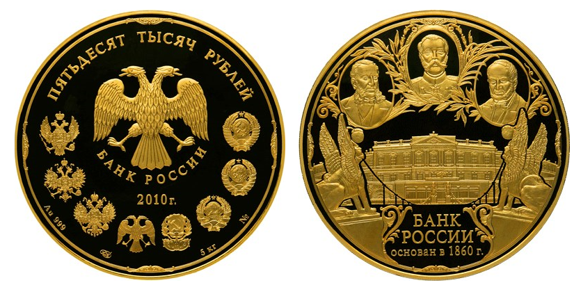 Две монеты. Это 50 000 рублей «150-летие Банка России» (2010 г.) и «175-летие сберегательного дела в России» (2016 г.), до 25 млн руб. Это самые дорогие юбилейные монеты, отчеканенные когда-либо в нашей стране. Помимо этого, они относятся к классу инвестиционных монет, поскольку в каждой из них содержится 5 килограмм химического золота. В связи с тем, что они произведены малыми тиражами – 50 и 15 экземпляров, соответственно, они обладают еще и высокой коллекционной стоимостью. Их цена даже на этапе начала продаж превышала стоимость драгоценного металла, из которого они произведены, и согласовалась с каждым клиентом в индивидуальном порядке. Примечательно, что самые дорогие юбилейные монеты принимаются к оплате по номиналу. По теме: Самая дорогая царская монета – 4,43 млн долларов.