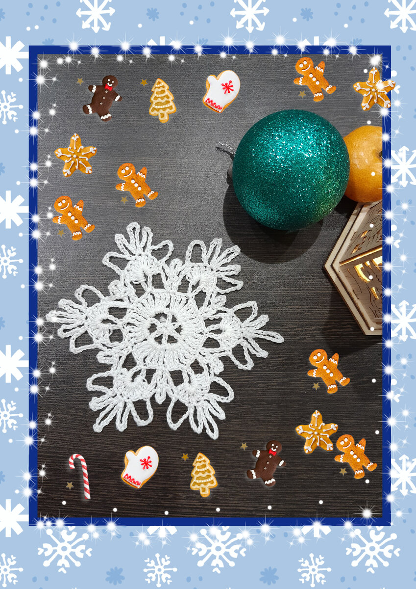 Сегодня очаровательная снежинка в вашу коллекцию. Вяжется быстро и просто. 4 воздушных петли (в.п.) соединить в кольцо. 1 ряд. 6 в.п. (считается как 1 столбик с накидом (ст.с/н) и *3 воздушные петли (в.п.), 1 ст.с/н*. Повторить от * и до * до еще 4 раза. (6 ст., 6 арок из 3 в.п.) 2 ряд. 4 в.п. (считается как 1 ст.с/н), в арку из 3 в.п. предыдущего ряда провязать 2 ст.с/н, пико из 10 в.п., 3 ст.с/н, в каждую следующую арку провязать 3 ст.с/н, пико из 10 в.п., 3 ст.с/н (веер из 6 ст.с/н, разделенный пико). Соединить первый и последний столбик ряда соединительной петлей. 3 ряд. *4 в.п. (считается как 1 ст.б/н и 3 в.п.), в пико провязать 9 ст.с/н (веер из 9 ст.с/н), 3 в.п., пропустить 2 петли предыдущего ряда после пико, столбик без накида (ст.б/н) (в последний столбик с накидом веера из 6 ст.с/н), 5 в.п., 1 ст.б/н в следующую петлю (в первый столбик с накидом следующего веера из 6 ст.с/н)*. Повторить от * и до * еще 5 раз. 4 ряд. Провязать 5 соединительных петель по петлям предыдущего ряд