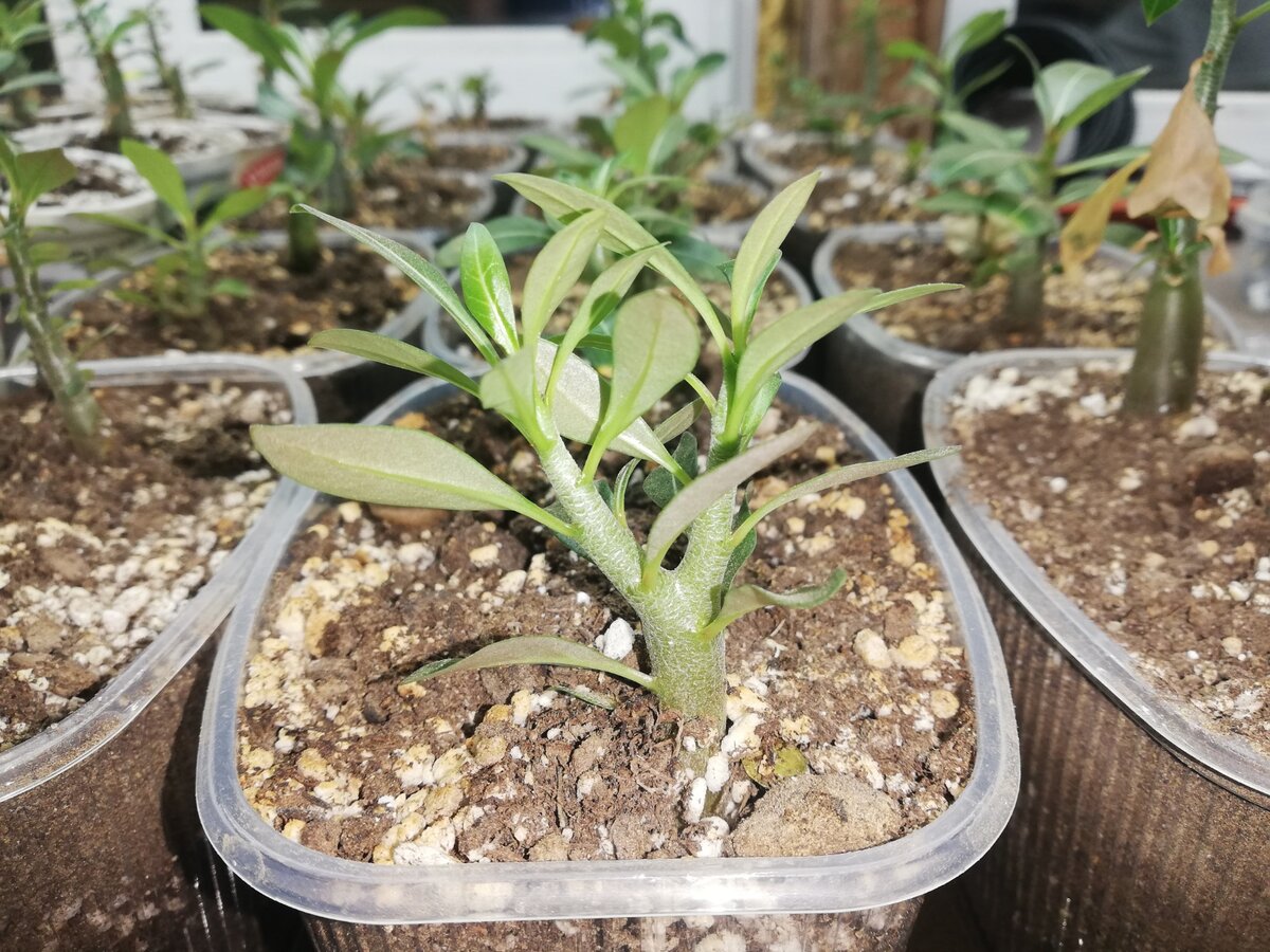 Заметил, что некоторые мои Адениумы начинают давать боковые отростки даже без прищипывания. Т.е. с самого малого возраста начинают уже сами формировать свой взрослый вид. Где-то вычитал, что это на генетическом уровне у них. Что уже изначально в них заложено ветвление. Интересно будет вырастить подобные экземпляры, дождаться цветения и семена, а уже потом эти семена попробовать посадить и посмотреть, что получится. Передастся по наследству такое хорошее качество, или нет. Можно, конечно, попробовать привить Адениум, но это не так интересно, как прорастить изначально ветвистое растение из семян. Кто-нибудь уже пробовал подобные эксперименты проводить? Если было, то поделитесь результатом и впечатлениями? Также заметил, что в теплице, которая у меня на даче, Адениумы ветвятся. А те, что посажены у меня дома, просто растут и наращивают постепенно каудекс. Но на даче, хоть какое-то, но естественное солнце зимой имеется, плюс дополнительная подсветка. Те, что дома, только на подсветке расту