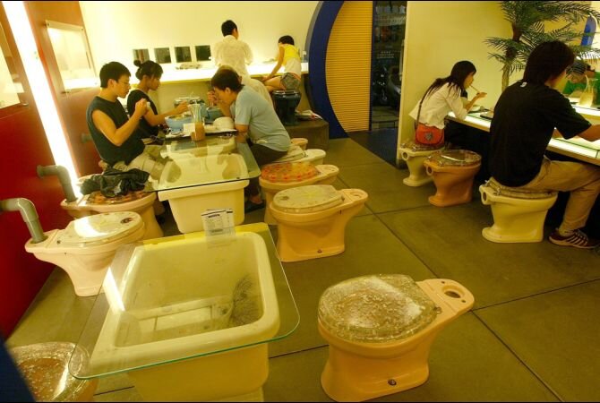 В китайском городе Хангжу (провинция Жейянг) есть недорогой ресторан под названием The Modern Toilet Restaurant, интерьер которого оформлен на «туалетную» тему. Мороженое в виде какашки, подушки в виде какашки, посуда в виде биде и унитазиков, светильники в виде писсуаров – всё вокруг говорит о том, что вы в туалете, а не в ресторане.   Этот китайский ресторан принадлежит тому же человеку, которому принадлежат и остальные подобные места на Тайване и в Гонг-Конге. Унитазы вместо стульев и мороженое в виде какашек - их фирменный стиль. Wang Tzi-wei – владелец сети двенадцати ресторанов по всему Тайваню, считает, что туалет – замечательное место, где можно покушать и, именно в подобной обстановке, по его словам, к людям чаще всего приходит аппетит. : ))) Несмотря на такую извращенную модель ресторанного бизнеса, аналогичный ресторан-туалет, открытый ранее на острове Тайвань, пользуется большим успехом у туристов и жителей города Тайпей. А теперь успех повторяется и в Китае. Все очень