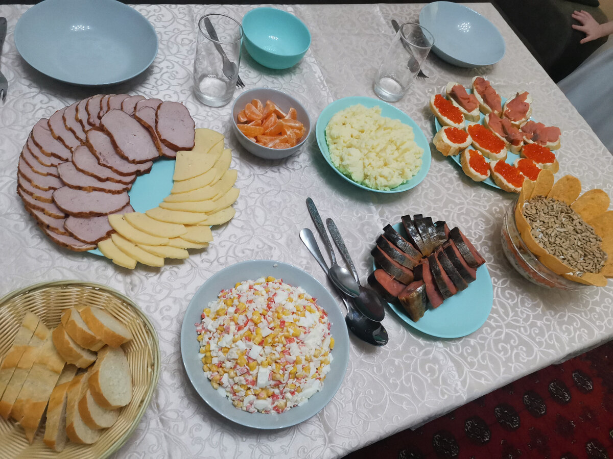 На дворе 6 января, а до меня только дошло, что в этом году я не рассказывала что же было на нашем новогоднем столе. Каждый год рассказывала-показывала и если почитать статьи подряд, то станет понятно, что уменьшение количества блюд было постепенным, мы всё таки не резко отказались от традиции "чтобы стол ломился". 2020 год. Та самая статья про скатерть ))) 2021 год. 2022 год. В этом году мы встречали новый год втроем - я, муж и дочь. Готовить много еды не было никакого смысла и выбрали компромиссное, самое простое меню: И даже из этого мы кое-что выкинули, потому что не осилили съесть! Нет, не бутерброды с икрой, а крабовый салат. Но стоит сказать, что мы начали есть салаты еще до нового года, примерно за неделю. Я готовила селедку под шубой и оливье. Его мне помогала резать Лера, под песни из советских фильмов. В принципе мы салатов наелись, я пока больше не хочу, поэтому несчастной себя из-за отсутствия 10 блюд на новогоднем столе, не чувствую. Меня больше расстраивает что каж